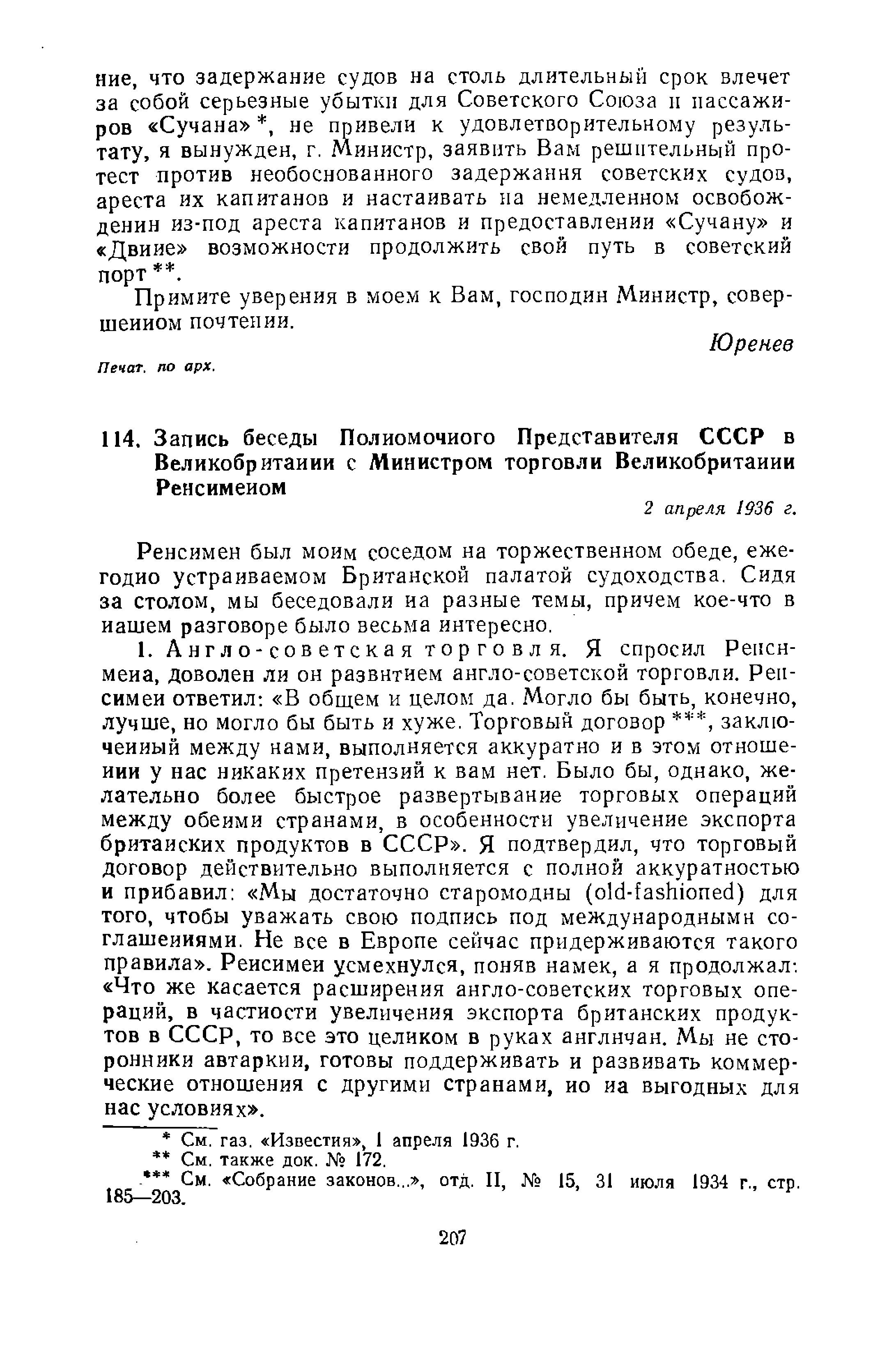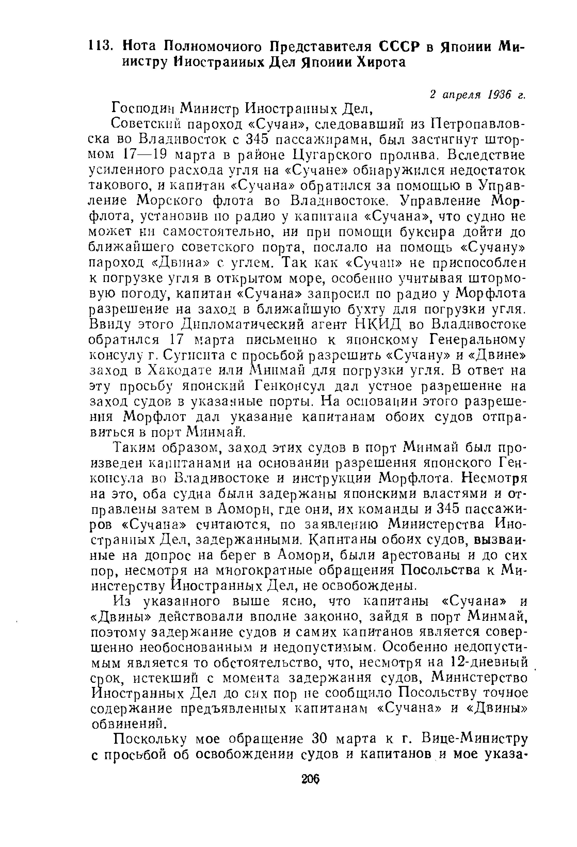 Поскольку мое обращение 30 марта к г. Вице-Министру с просьбой об освобождении судов и капитанов и мое указание, что задержание судов на столь длительный срок влечет за собой серьезные убытки для Советского Союза и пассажиров «Сучана»*, не привели к удовлетворительному результату, я вынужден, г. Министр, заявить Вам решительный протест против необоснованного задержания советских судов, ареста их капитанов и настаивать на немедленном освобождении из-под ареста капитанов и предоставлении «Сучану» и «Двине» возможности продолжить свой путь в советский порт **.