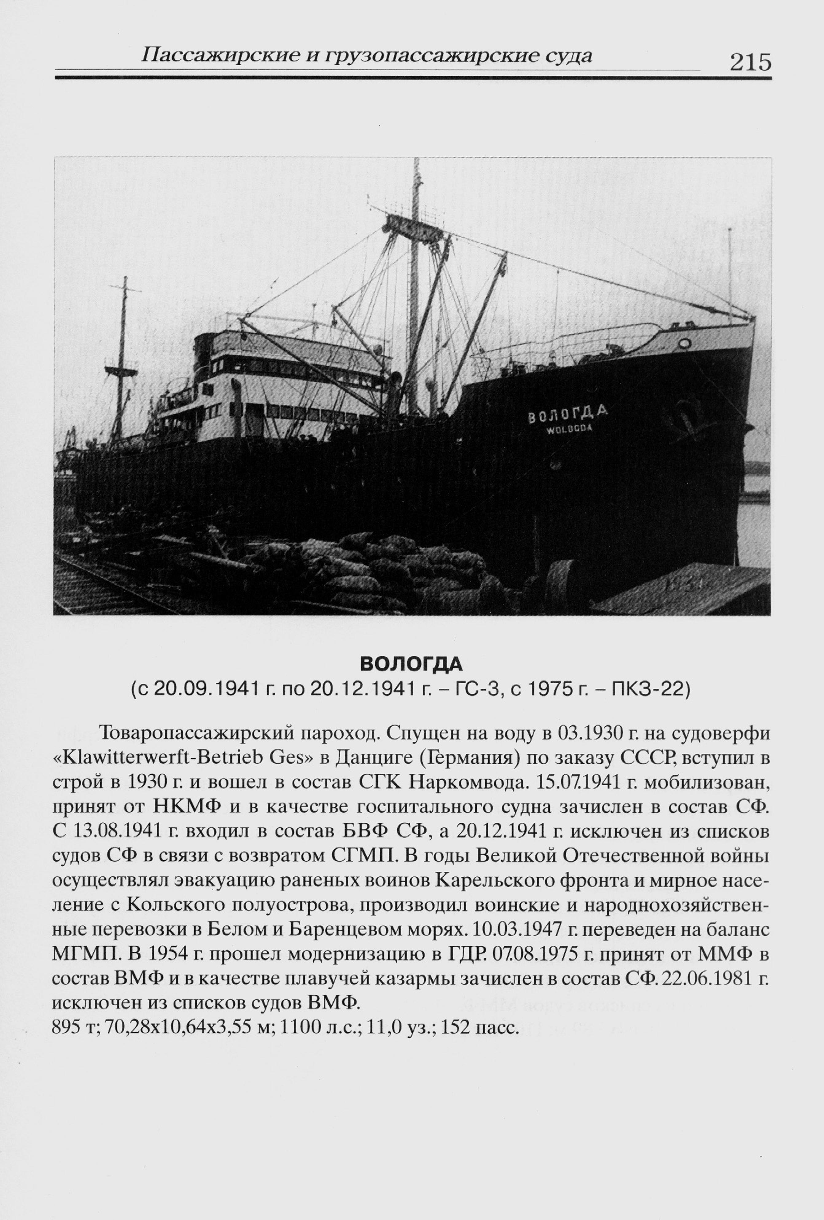 Товаропассажирский пароход. Спущен на воду в 03. 1930 г. на судоверфи «Klawitterwerft-Betrieb Ges» в Данциге (Германия) по заказу СССР, вступил в строй в 1930 г. и вошел в состав СГК Наркомвода. 15. 07. 1941 г. мобилизован, принят от НКМФ и в качестве госпитального судна зачислен в состав СФ. С 13. 08. 1941 г. входил в состав БВФ СФ, а 20. 12. 1941 г. исключен из списков судов СФ в связи с возвратом СГМП. В годы Великой Отечественной войны осуществлял эвакуацию раненых воинов Карельского фронта и мирное население с Кольского полуострова, производил воинские и народнохозяйственные перевозки в Белом и Баренцевом морях. 10. 03. 1947 г. переведен на баланс МГМП. В 1954 г. прошел модернизацию в ГДР. 07. 08. 1975 г. принят от ММФ в состав ВМФ и в качестве плавучей казармы зачислен в состав СФ. 22. 06. 1981 г. исключен из списков судов ВМФ.