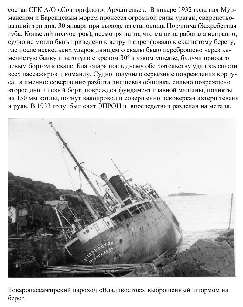 На обратном пути сильным штормом он был брошен в каменное ущелье в Полярном море, где и находится по сие время. Сейчас, начались работы по подъему "Владивостока", находящегося частично в воде. Подъем производятся на побережье между Мурманском и Архангельском, в пустынном и глухом районе экспедицией Эпрона.