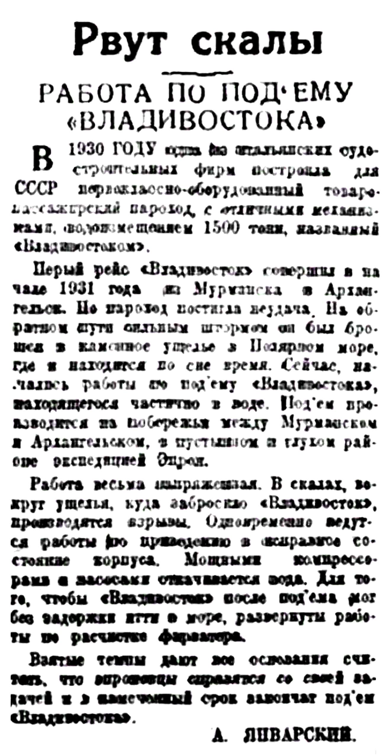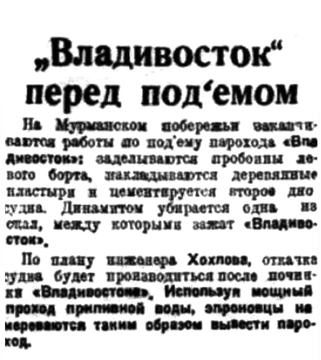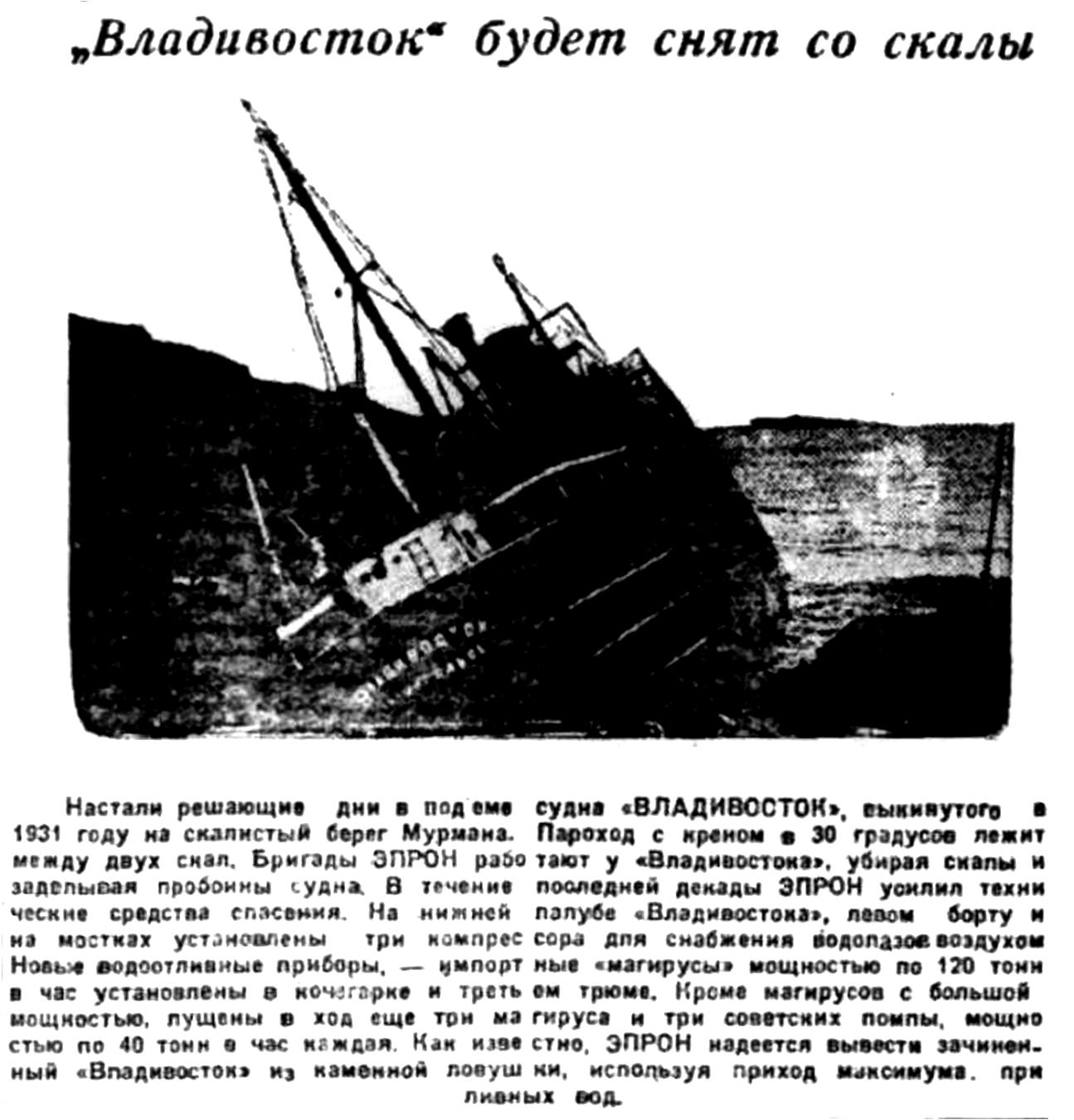 Настали решающие дни в подъеме судна «ВЛАДИВОСТОК», выкинутого в 1931 году на скалистый берег Мурмана. Пароход с креном в 30 градусов лежит между двух скал. Бригады ЭПРОН работают у «Владивостока», убирая скалы и заделывая пробоины судна. В течение последней декады ЭПРОН усилил технические средства спасения. На нижней палубе «Владивостока», левом борту и на мостках установлены три компрессора для снабжения водолазов воздухом. Новые водоотливные приборы, — импортные «магирусы» мощностью по 120 тонн в час установлены в кочегарке и третьем трюме. Кроме магирусов с большой мощностью, пущены в ход еще три магируса и три советских помпы, мощностью по 40 тонн в час каждая. Как известно, ЭПРОН надеется вывести зачиненный «Владивосток» из каменной ловушки, используя приход максимума, приливных вод.