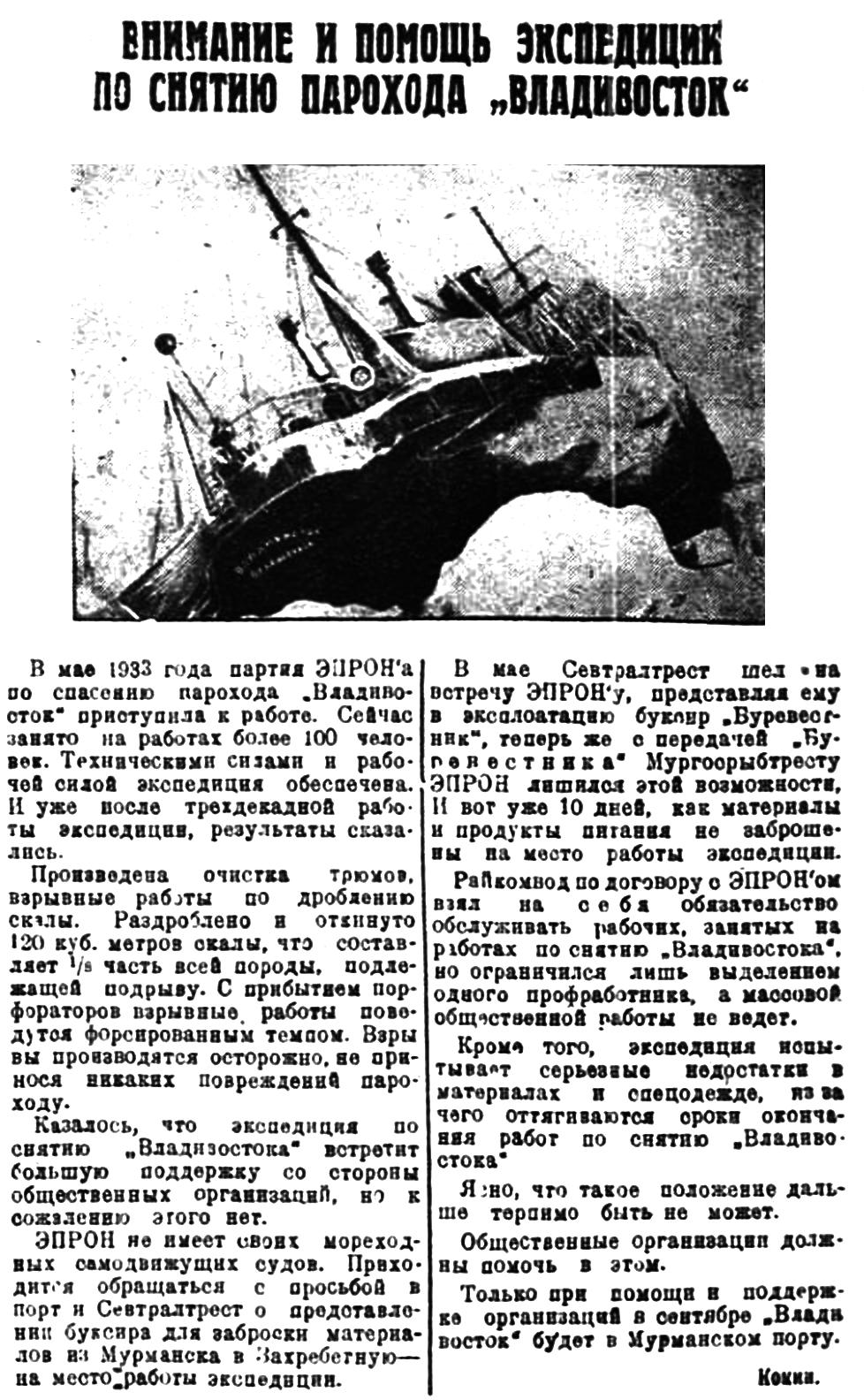 В мае 1933 года партия ЭПРОН'а по спасении парохода " Владивосток" приступила к работе. Сейчас занято на работах более 100 человек. Техническими силами и рабочей силой экспедиция обеспечена. И уже после трехдекадной работы экспедиции, результаты сказалось.