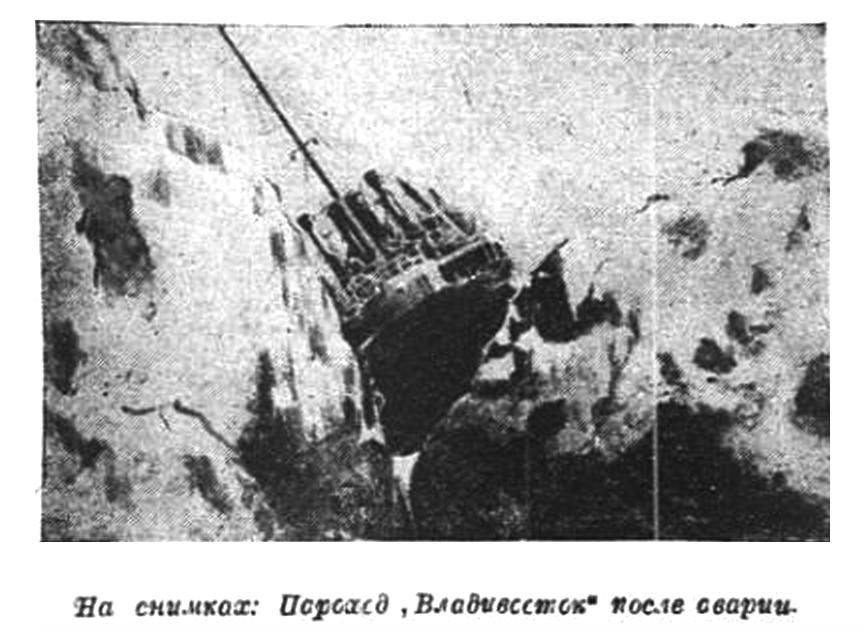 Работа весьма напряженная. В скалах, вокруг ущелья, куда забросило "Владивосток", производятся взрывы. Одновременно ведутся работы по проведению в исправное состояние корпуса. Мощными компрессорами и насосами откачивается вода. Для того, чтобы "Владивосток" после подъема мог без задержки итти в море, развернуты работы по расчистке фарватера.