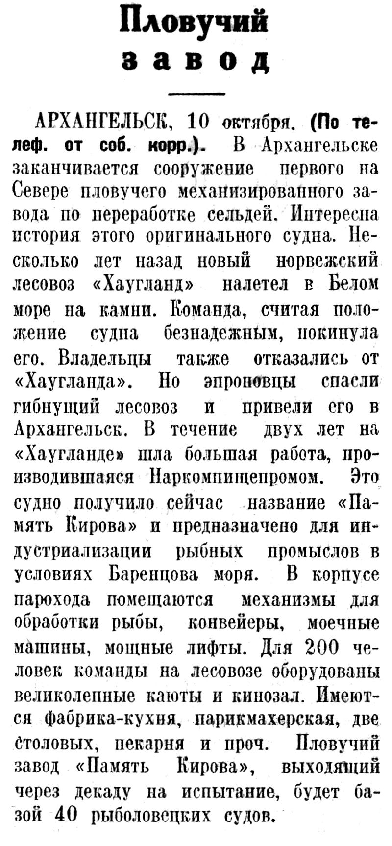 АРХАНГЕЛЬСК, 10 октября. (По телеф. от соб. корр.). В Архангельске заканчивается сооружение первого на Севере пловучего механизированного завода по переработке сельдей. Интересна история этого оригинального судна. Несколько лет назад новый норвежский лесовоз «Хаугланд» налетел в Белом море на камни. Команда, считая положение судна безнадежным, покинула его. Владельцы также отказались от «Хаугланда». Но эпроновцы спасли гибнущий лесовоз и привели его в Архангельск. В течение двух лет на «Хаугланде» шла большая работа, производившаяся Наркомпищепромом. Это судно получило сейчас название «Память Кирова» и предназначено для индустриализации рыбных промыслов в условиях Баренцова моря. В корпусе парохода помешаются механизмы для обработки рыбы, конвейеры, моечные машины, мощные лифты. Для 200 человек команды на лесовозе оборудованы великолепные каюты и кинозал. Имеются фабрика-кухня, парикмахерская, две столовых, пекарня и проч. Пловучий завод «Память Кирова», выходящий через декаду на испытание, будет базой 40 рыболовецких судов.