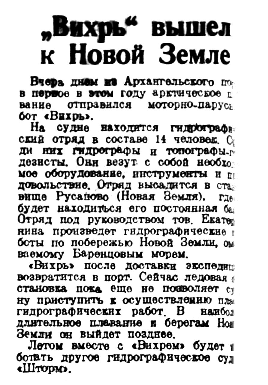 В Архангельск возвратились гидрографические суда «Шторм» и «Песец», проводившие в течение арктической навигации большую работу у берегов Новой Земли. Экспедиция на «Шторме» (капитан т. Бахтин) выполнила задание на 141 процент. Она производила промеры глубин моря и установила сигнальные знаки.