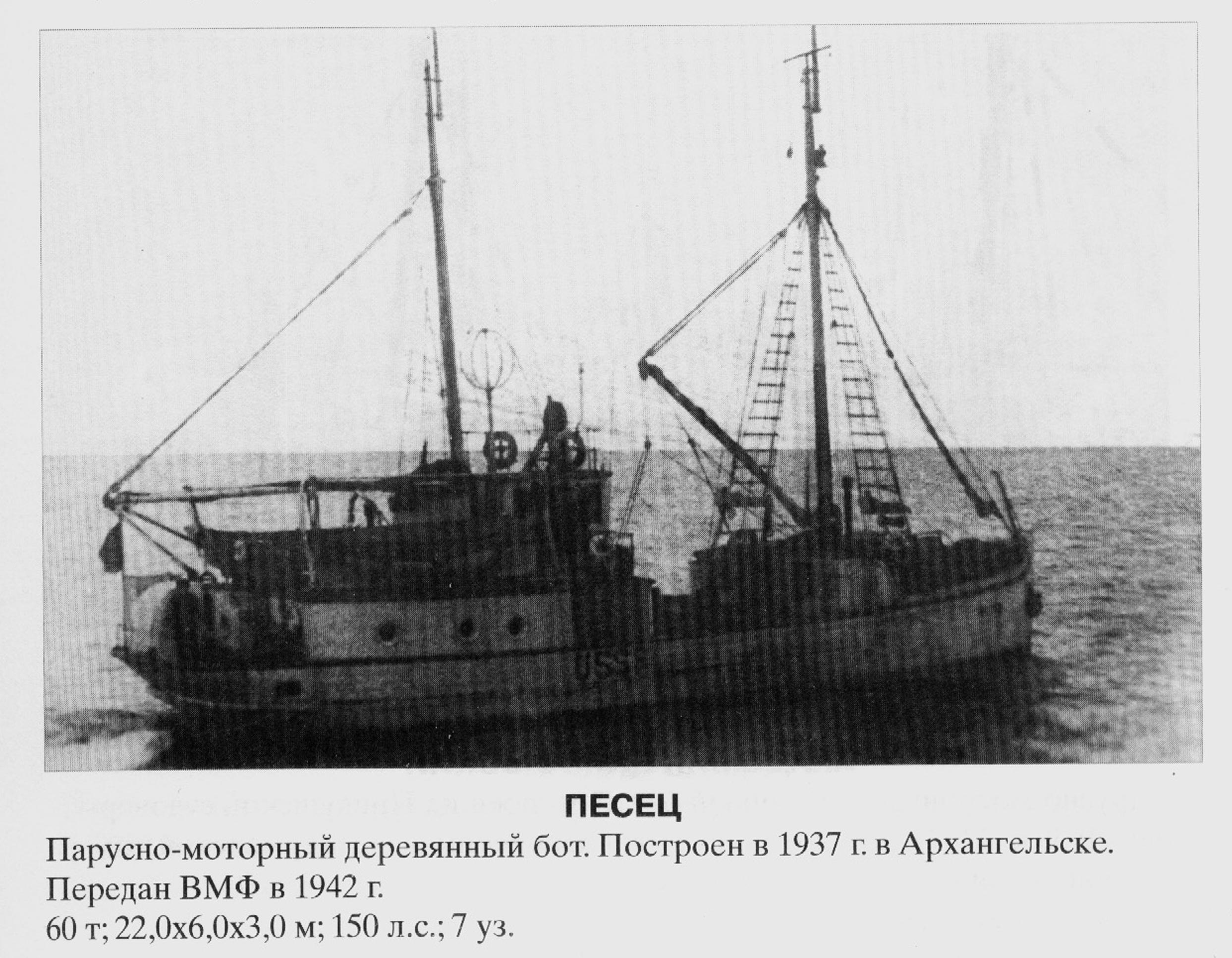 Парусно-моторный деревянный бот. Построен в 1937 г. в Архангельске. Передан ВМФ в 1942 г.