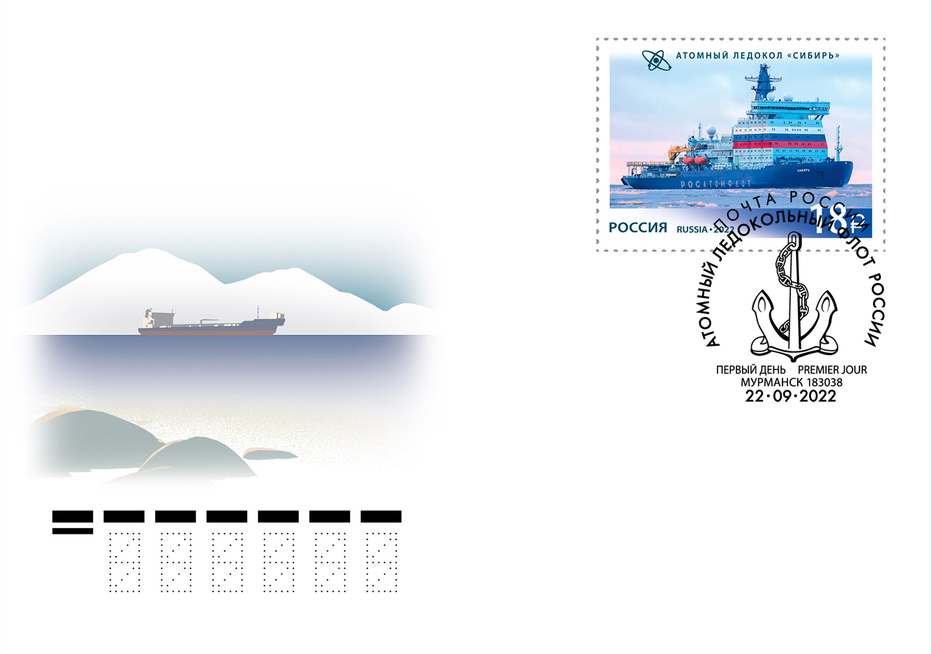 На почтовых марках изображены атомные ледоколы «Арктика» и «Сибирь» на фоне ледовых пейзажей и символы атома.