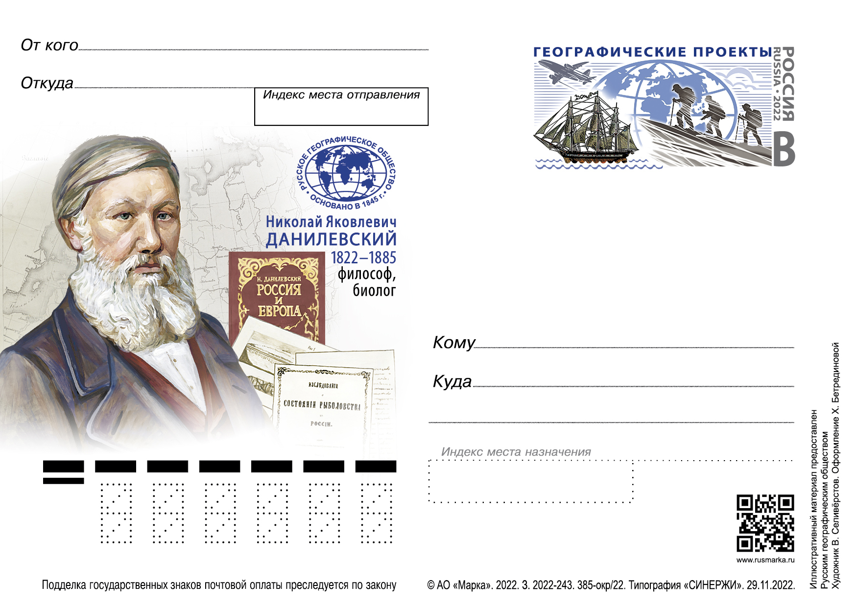 С 1853 года Данилевский неоднократно направлялся российским правительством в экспедиции для изучения состояния рыбных запасов и рыболовства в низовьях Волги, на Каспийском море, а впоследствии на Белом море и севере России. Всего было совершено 9 экспедиций, в результате которых проведено исследование всех вод европейской России. Помимо работы в области рыболовства и промысла тюленей, он был главой комиссии, устанавливающей правила использования проточной воды в Крыму (1872–1879), также управлял Никитским ботаническим садом (1879–1880). Главным трудом Н.Я. Данилевского стала книга «Россия и Европа», выпущенная в 1869–1871 гг. в журнале «Заря». Работал над ней учёный на протяжении четырёх лет с 1864 года. Именно в этой книге Данилевский излагает свою концепцию существования одиннадцати культурно-исторических типов, выражает своё мнение по поводу общности исторического процесса и, наконец, затрагивает тему славянофильства и западничества. За свою деятельность он был награждён золотой медалью Русского географического общества, вошёл в состав Совета Министерства государственных имуществ, где принимал активное участие в выработке законов, которые регулировали состояние рыбных богатств в стране. На основной иллюстрации изображены портрет Н.Я. Данилевского, его произведения на фоне карты исследуемых территорий, а также логотип РГО; на оригинальной марке - изображения, символически отражающие географические проекты.