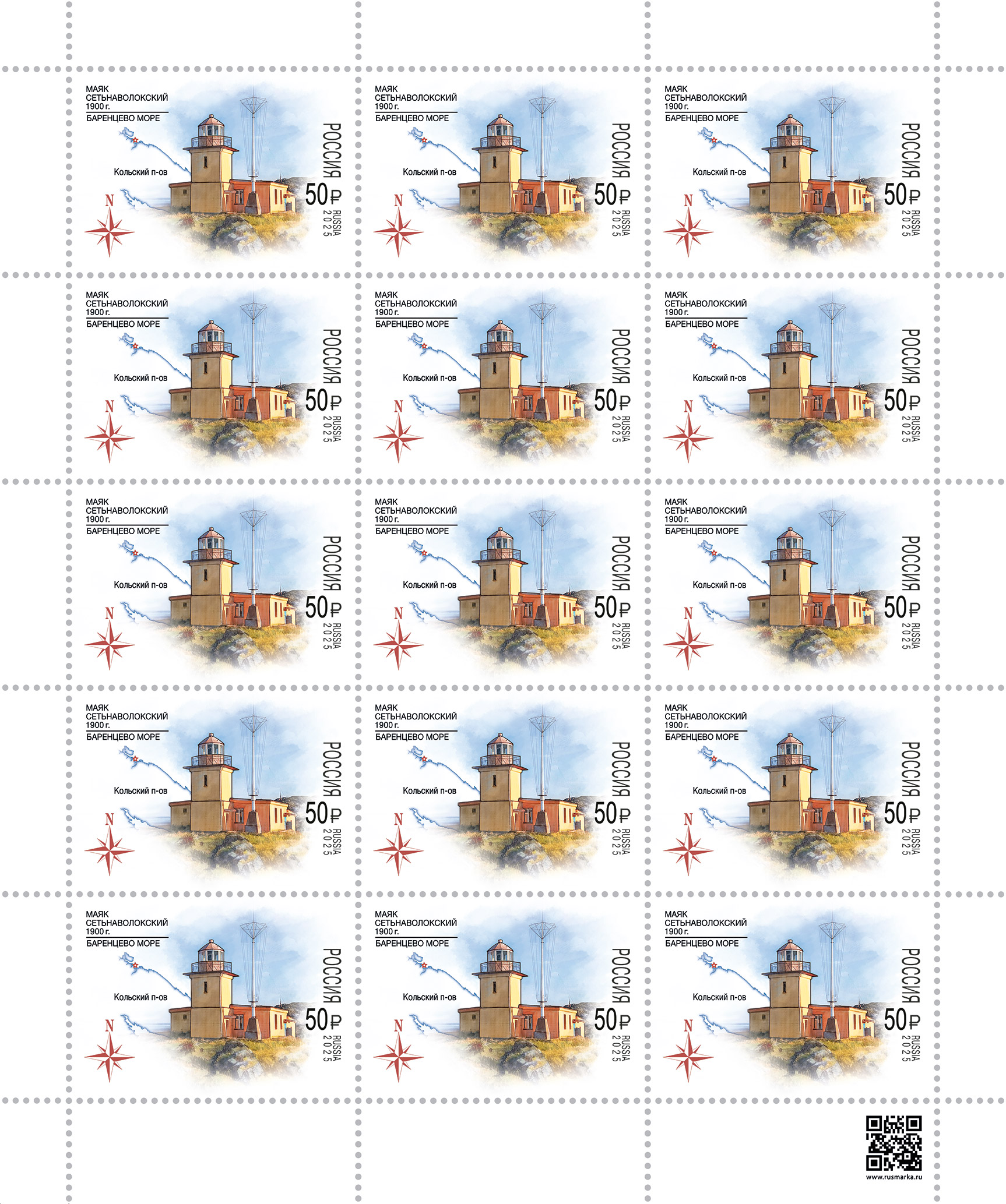 На почтовых марках изображены Кыз-Аульский маяк на фоне карты полуострова Крыма и розы ветров и Сетьнаволокский маяк на фоне карты Кольского полуострова и розы ветров.