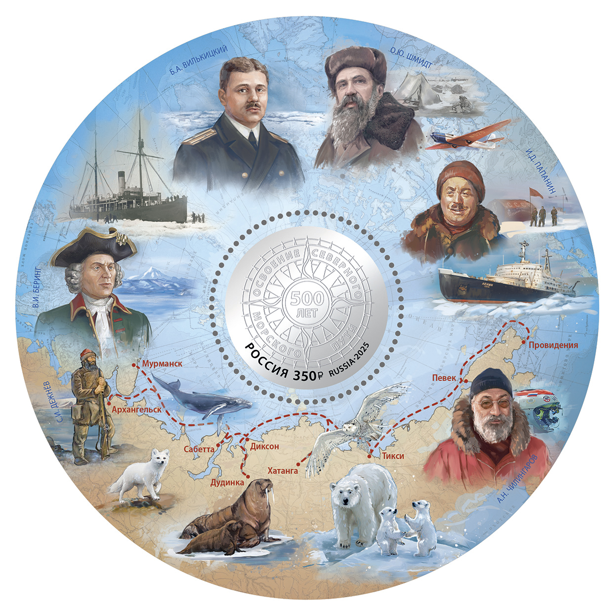 На почтовой марке изображена роза ветров; на полях блока — известные мореплаватели и полярные исследователи России на фоне карты: С.И. Дежнёв, В.И. Беринг, Б.А. Вилькицкий, О.Ю. Шмидт, И.Д. Папанин, А.Н. Чилингаров, а также ледоколы «Таймыр», «Ленин», научно-исследовательский аппарат «Мир-1» и животные, обитающие в северных морях.