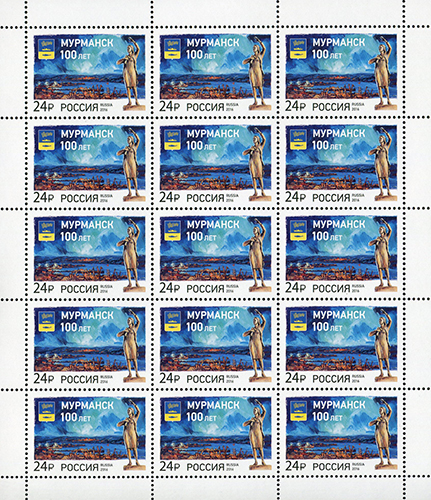 На почтовой марке изображены герб города, памятник «Ждущая» на фоне панорамы порта и полярное сияние.