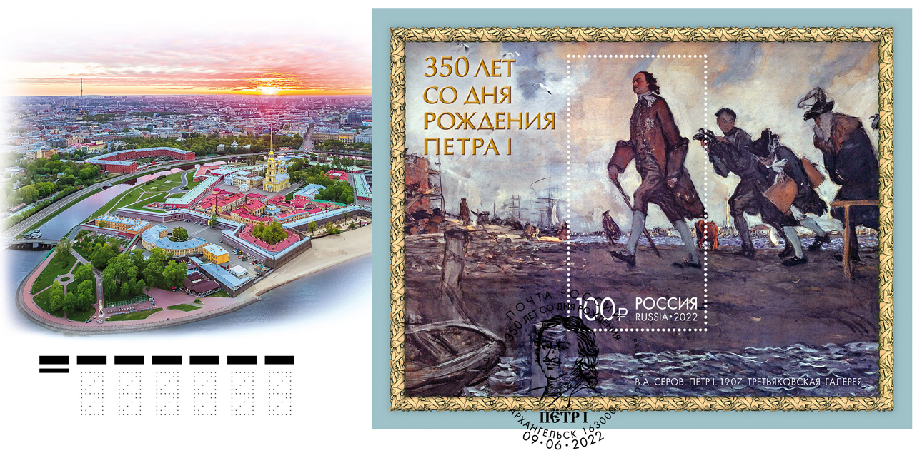 На почтовом блоке изображена картина В.А. Серова «Пётр I» (1907 г., Государственная Третьяковская галерея).