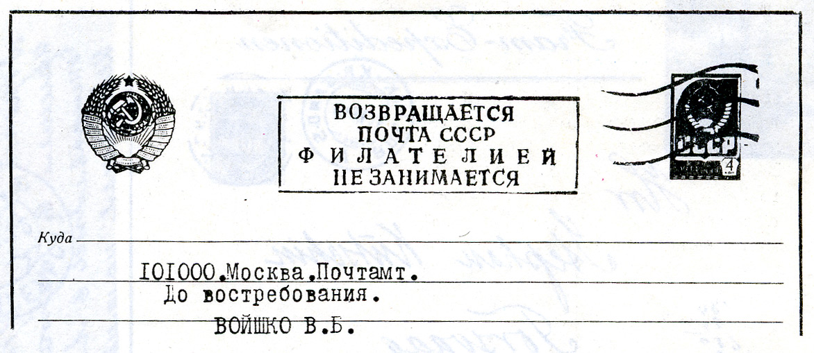 И, не желая того, ААНИИ вынужден возвращать корреспонденцию адресата и ставить штамп «Возвращается. Почта СССР филателией не занимается». Круг замкнулся. Позади уже 1988 год, но по-прежнему действует запрет. Кстати, этот штамп, поистине одиозное явление на ниве советской филателии, своей недемократической сущностью уже привлек к себе внимание зарубежной филателистической печати.