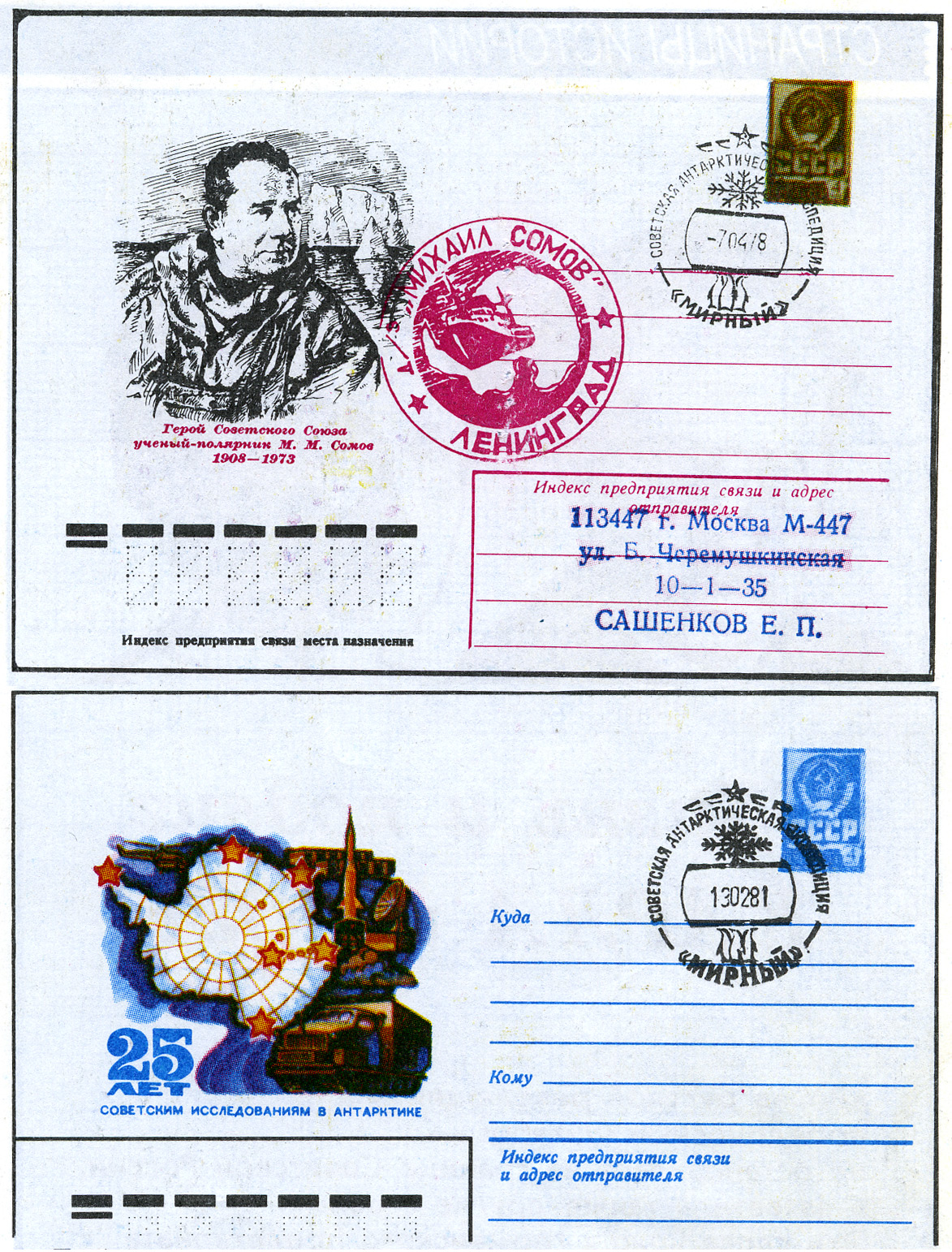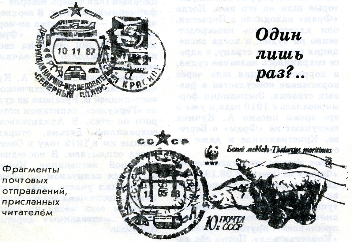 Взглянем на переписку филателистов и полярников с Минсвязи СССР и его управлениями. Здесь приведены весьма убедительные доводы коллекционеров о том, что каждое государство, участвующее в исследовании Антарктиды, согласно принятым международным нормам, имеет право на учреждение там собственной почты. Здесь и резонные возражения против создания почтового отделения в Ленинграде, которое бы «заменило» почту полярных станций. Кстати, суррогаты гашений уже длительное время распространяет В/О «Международная книга». Выпускаемые по его инициативе дубликатные штемпеля используются для придания красивым конвертам (изготовляемым чаще всего инофирмами) подлинности... Эти «гашения» справедливо именуются зарубежными филателистами фальсификатами, подделками.