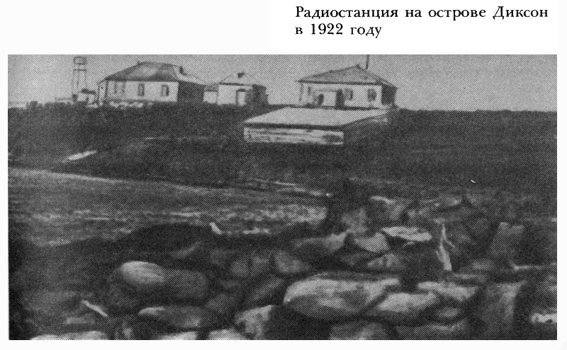 14 августа мы прибыли на полярную радиостанцию острова Диксон, чтобы ждать парохода, который должен привезти смену персонала станции. Построена она летом 1915 года, а работать начала с 1916 года. Расположена на северном берегу бухты и состоит из жилого дома, радиостанции, бани и склада. Кроме того, есть сарай, построенный еще в 1902 году под склад угля для экспедиции Э. В. Толля. Радиостанция искровая, довольно мощная, имеет связь с Дудинкой и Маре-Сале.