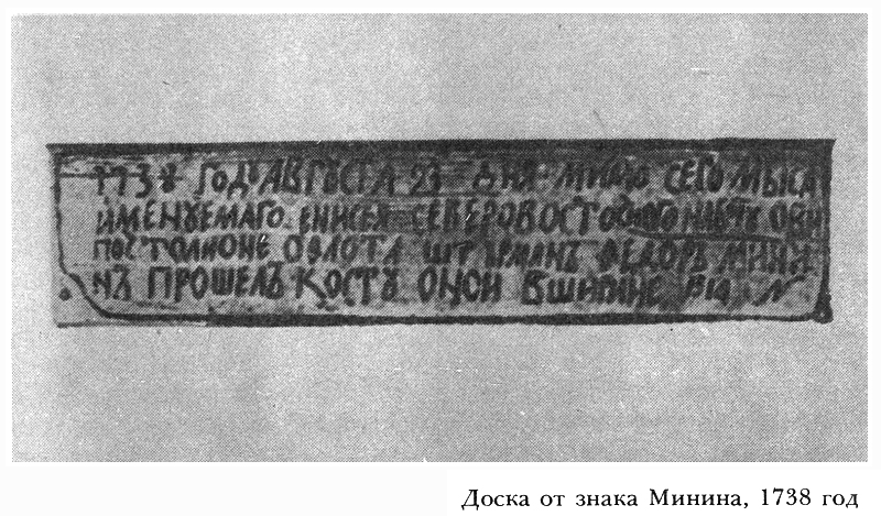 На следующий день на восточном мысе бухты Двух Медведей, — мы ночевали, Бегичев нашел развалины знака, а около него доску. Одна сторона доски замшела и подгнила, на другой, еще свежей, славянской вязью было написано: "1738 году августа 23 мимо сего мыса именуемаго Енисея северо-восточного на боту оби почтолионе о флота штурманъ Федоръ Мининъ прошелъ к осту оной в ширине 73 14 N".