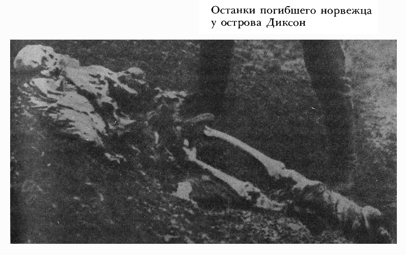 Такова документальная картина виденного нами на мысе, напротив Диксона. Положение погибшего — навзничь, да еще с подогнутой ногой — свидетельствует о его внезапной гибели на ходу, а не на отдыхе. В последнем случае усталый человек стремится присесть или прилечь за укрытие и так в спокойной позе замерзает. Здесь этого нет. Поза погибшего, положение его тела в начале крутого гладкого каменного склона явно свидетельствуют о том, что, спускаясь по нему, человек поскользнулся, упал, потерял сознание, может быть, даже получил сотрясение мозга и замерз. Истощен и ослаблен он был очень сильно, в этом нет сомнения, и замерзнуть мог быстро, не приходя в сознание. Винтовка и лыжи, если они были, скатились, наверное, при падении на лед и были унесены ледоходом.