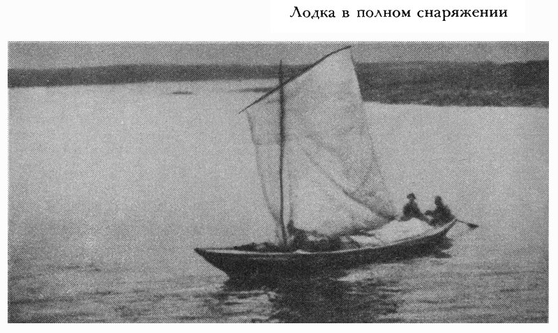 Купленную в Дудинке рыбачью лодку завезли в апреле во Введенское, расположенное в 25 километрах от истока Пясины. Там в промысловой избушке летом живет крестьянин Филипп Никитич Лаптуков, по прозвищу Лимка. У него и сложили нужное для экспедиции снаряжение и продовольствие. Кроме большой лодки взяли для разъездов легкую долбленую "ветку". Из снаряжения — две палатки с брезентовыми полами, брезент, чайник, ведро, топоры, пилу. Для ремонта лодки завезли листовое железо, гвозди, смолу, вар. Путь будет дальний и, конечно, нелегкий, всякое может случиться. Из продовольствия берем сушки, сухари, крупу и кирпичный чай. Масла, сахару тогда везде было мало, не много их было и у нас. В основном мы рассчитывали на охоту, для чего имели дробовое ружье и две винтовки.