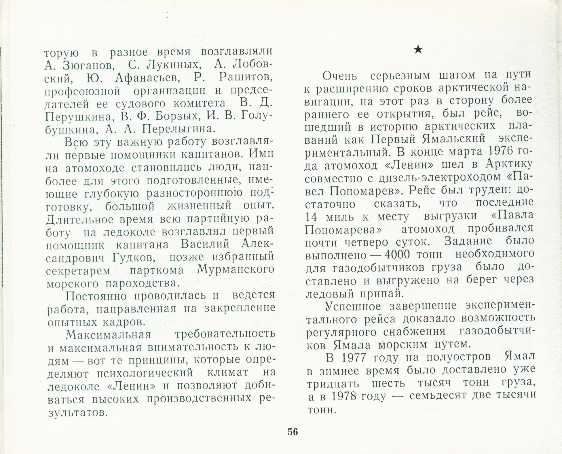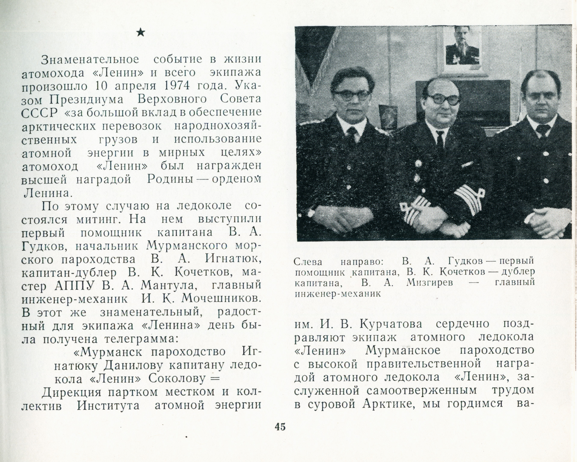Всю эту важную работу возглавляли первые помощники капитанов. Ими на атомоходе становились люди, наиболее для этого подготовленные, имеющие глубокую разностороннюю под: готовку, большой жизненный опыт. Длительное время всю партийную работу на ледоколе возглавлял первый помощник капитана Василий Александрович Гудков, позже избранный секретарем парткома Мурманского морского пароходства.
