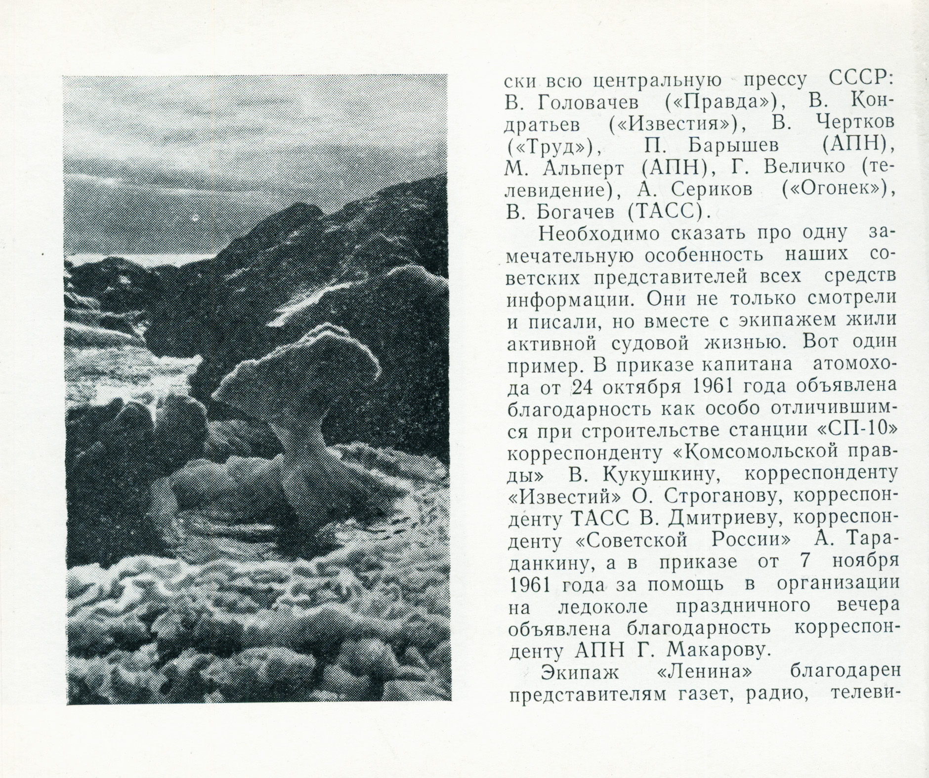 Необходимо сказать про одну замечательную особенность наших советских представителей всех средств информации. Они не только смотрели и писали, но вместе с экипажем жили активной судовой жизнью. Вот один пример. В приказе капитана атомохода от 24 октября 1961 года объявлена благодарность как особо отличившимся при строительстве станции «СП-10» корреспонденту «Комсомольской правды» В. Кукушкину, корреспонденту «Известий» О. Строганову, корреспонденту ТАСС В. Дмитриеву, корреспонденту «Советской России» А. Тараданкину, а в приказе от 7 ноября 1961 года за помощь в организации на ледоколе праздничного вечера объявлена благодарность корреспонденту АПН Г. Макарову.