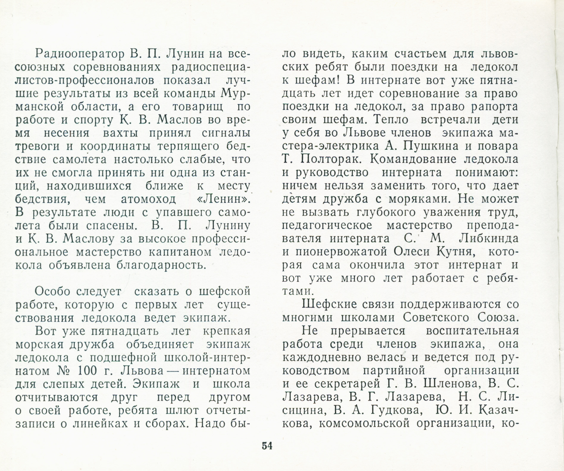 Вот уже пятнадцать лет крепкая морская дружба объединяет экипаж ледокола с подшефной школой-интернатом № 100 г. Львова - интернатом для слепых детей. Экипаж и школа отчитываются друг перед другом о своей работе, ребята шлют отчеты-записи о линейках и сборах. Надо было видеть, каким счастьем для Львовских ребят были поездки на ледокол к шефам! В интернате вот уже пятнадцать лет идет соревнование за право поездки на ледокол, за право рапорта своим шефам. Тепло встречали дети у себя во Львове членов экипажа мастера-электрика А. Пушкина и повара Т. Полторак. Командование ледокола и руководство интерната понимают: ничем нельзя заменить того, что дает детям дружба с моряками. Не может не вызвать глубокого уважения труд, педагогическое мастерство преподавателя интерната С. М. Либкинда и пионервожатой Олеси Кутня, которая сама окончила этот интернат и вот уже много лет работает с ребятами.