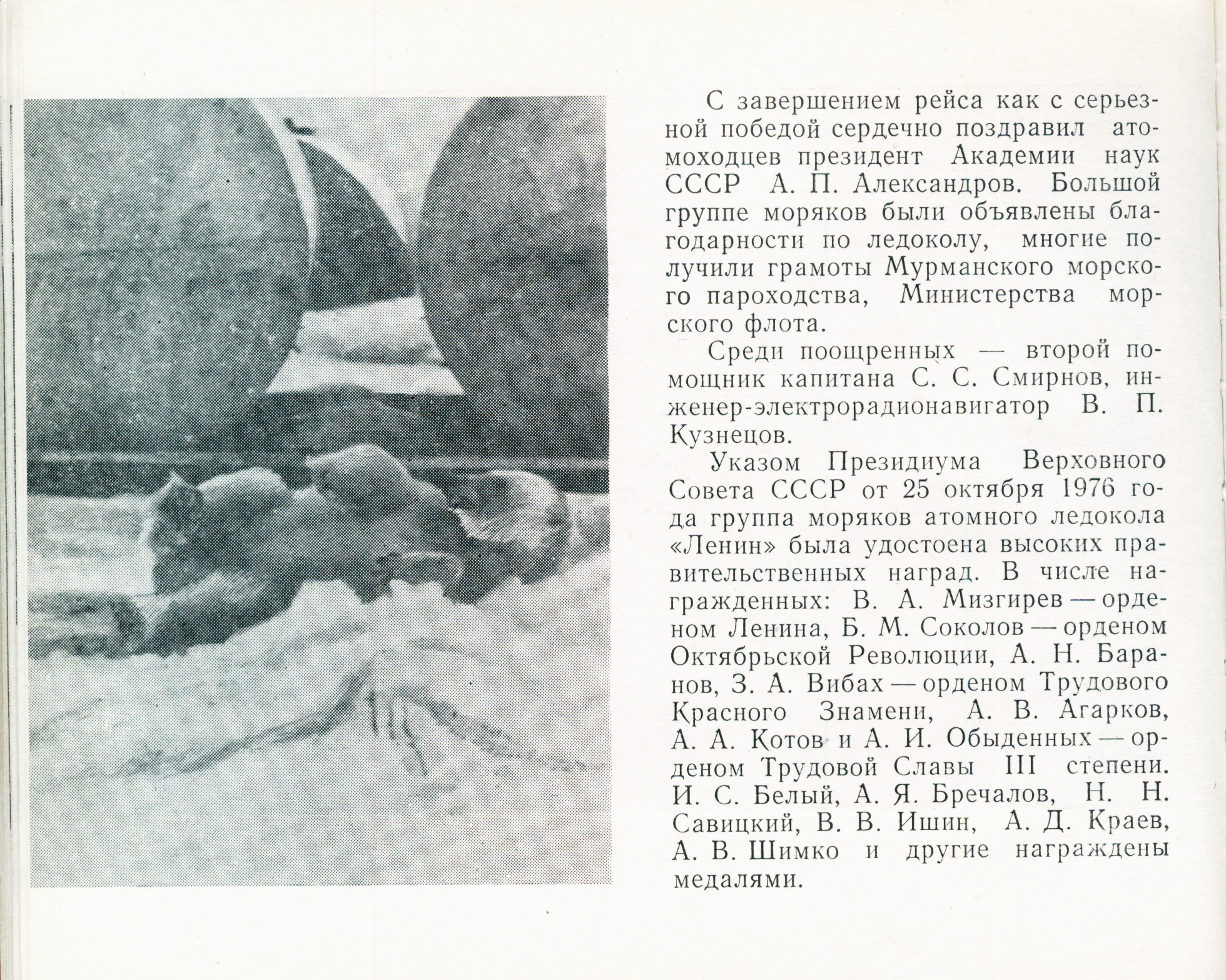 Указом Президиума Верховного Совета СССР от 25 октября 1976 года группа моряков атомного ледокола «Ленин» была удостоена высоких правительственных наград. В числе награжденных: В. А. Мизгирев - орденом Ленина, Б. М. Соколов - орденом Октябрьской Революции, А. Н. Баранов, 3. А. Вибах - орденом Трудового Красного Знамени, А. В. Агарков, А. А. Котов и А. И. Обыденных - орденом Трудовой Славы III степени. И. С. Белый, А. Я. Бречалов, Н. Н. Савицкий, В. В. Ишин, А. Д. Краев, А. В. Шимко и другие награждены медалями.
