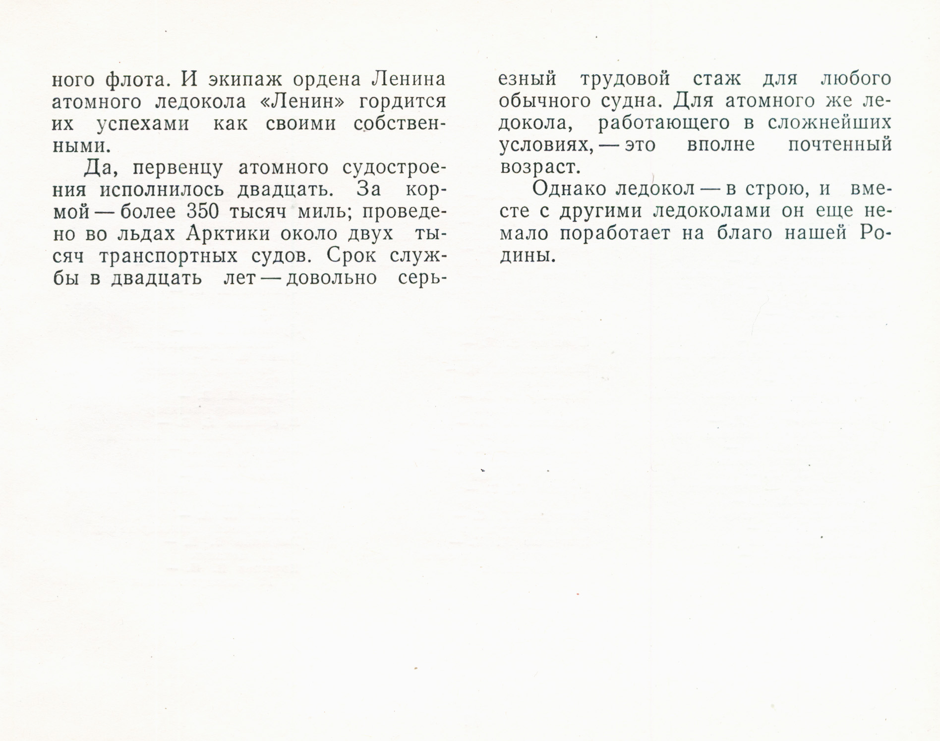 Да, первенцу атомного судостроения исполнилось двадцать. За кормой - более 350 тысяч миль; проведено во льдах Арктики около двух тысяч транспортных судов. Срок службы в двадцать лет - довольно серьезный трудовой стаж для любого обычного судна. Для атомного же ледокола, работающего в сложнейших условиях, - это вполне почтенный возраст.
