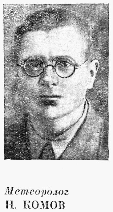 Командование экспедицией на "Челюскине" во главе с О. Ю. Шмидтом уделило очень много внимания научно-исследовательским работам по изучению всех тех атмосферных явлении, которыми сопровождался челюскинский рейс. До Колючинской бухты с нами ехал синоптик т. Простяков; на его обязанности лежало предсказание погоды. Аэролог т. Шпаковский при помощи радиозондов и шаров-пилотов "штурмовал небо" — исследовал высокие слои атмосферы, достигая иногда и стратосферы. Наконец круглосуточные наблюдения за текущей погодой вели метеорологи-наблюдатели О. Н. и Н. Н. Комовы.