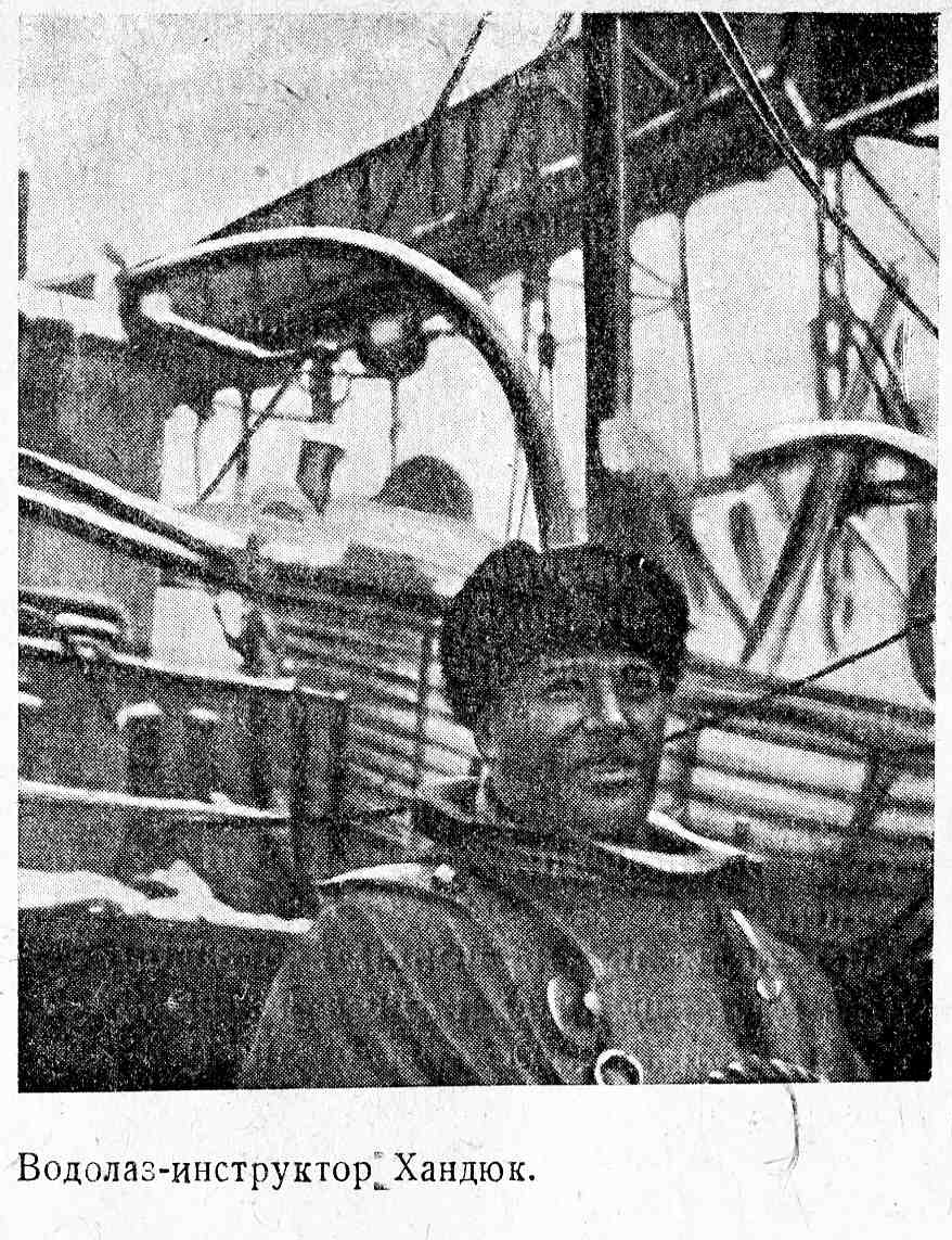 Охотник за пробоинами Хандюк прославился как чемпион... воздуха. Нам не хотелось бы повторять популярные, широко известные сведения о водолазном искусстве, во все же если среди читателей есть хоть малейшая часть людей, которые о водолазах знают мало, то наше небольшое отступление будет оправдано, тем более что вот уже три часа Хандюк не выходит из воды.