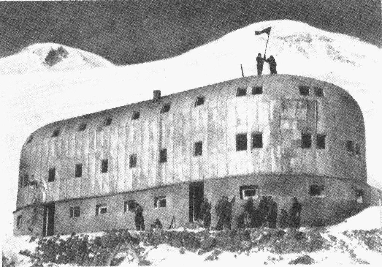 В феврале 1943 г. ко всем трудностям зимнего восхождения добавились и другие. Основные маршруты на подступах к "Приюту одиннадцати" и промежуточные базы были заминированы, и надо было идти по "целине", обходить базы, ночевать среди скал.