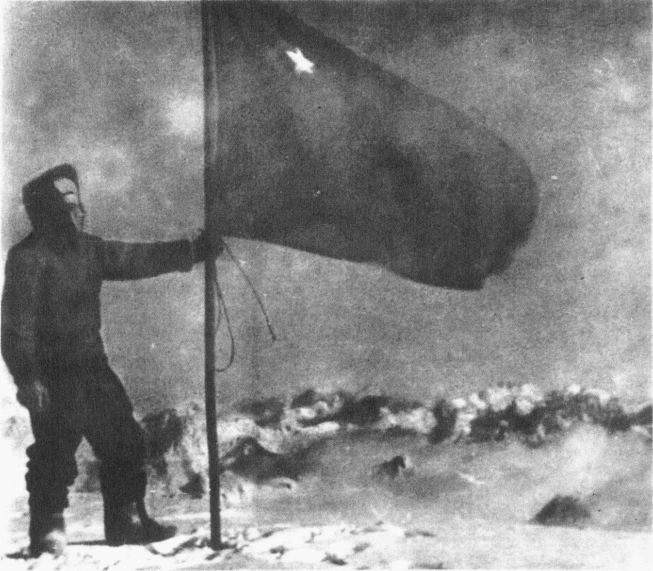 сломанного ветром древка с обрывками фашистского флага. Оно не устояло против Эльбрусского урагана. Победа!... Огромная радость охватила нас. Такая, какая бывает, может быть, только раз в жизни. Устанавливаем знамя Родины — и вниз к товарищам. Надо спешить — Эльбрус опять закрывает слепая вьюга.