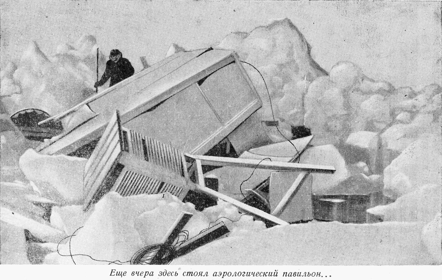 Глубокой ночью, когда аврал окончился, вдвоем с Колосовым пошли к аэрологическому павильону. На прежнем месте его не нашли. И только в 1,5 км от станции нашим взорам представилось печальное зрелище: среди хаотического нагромождения исковерканных ледяных глыб мы увидели несколько жалких обломков. Это все, что осталось от павильона.