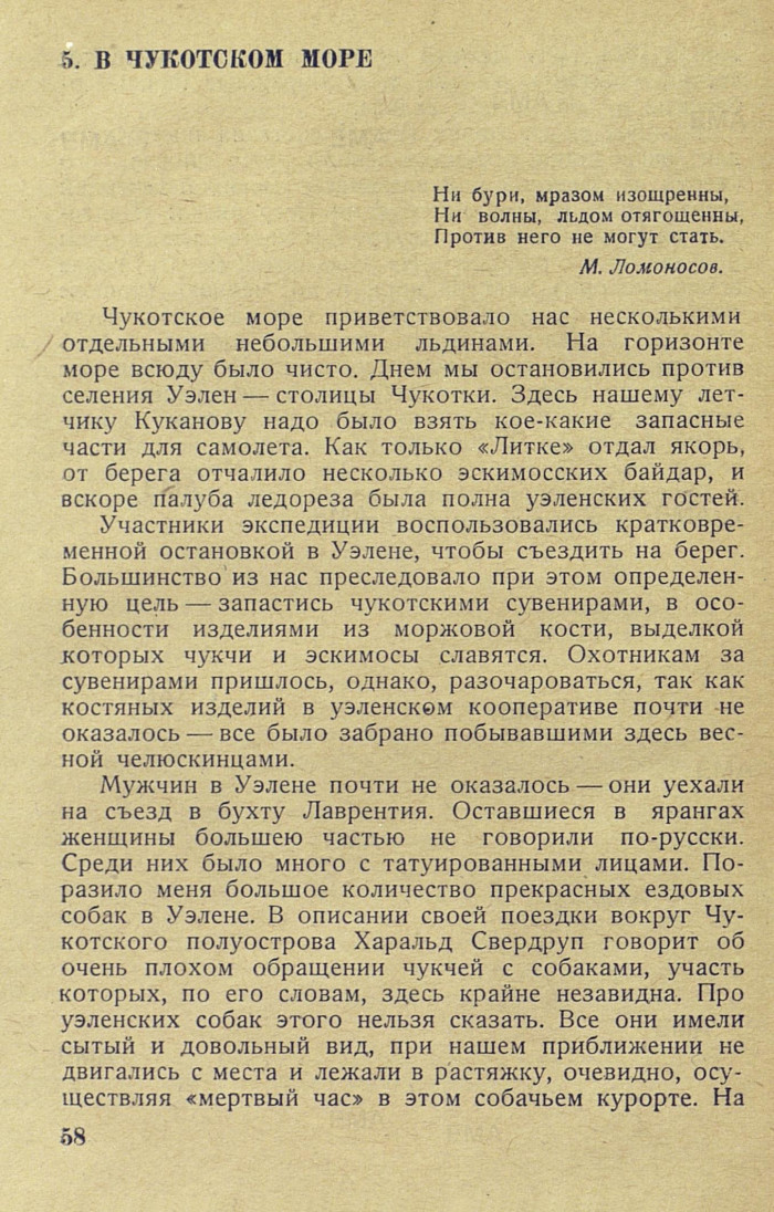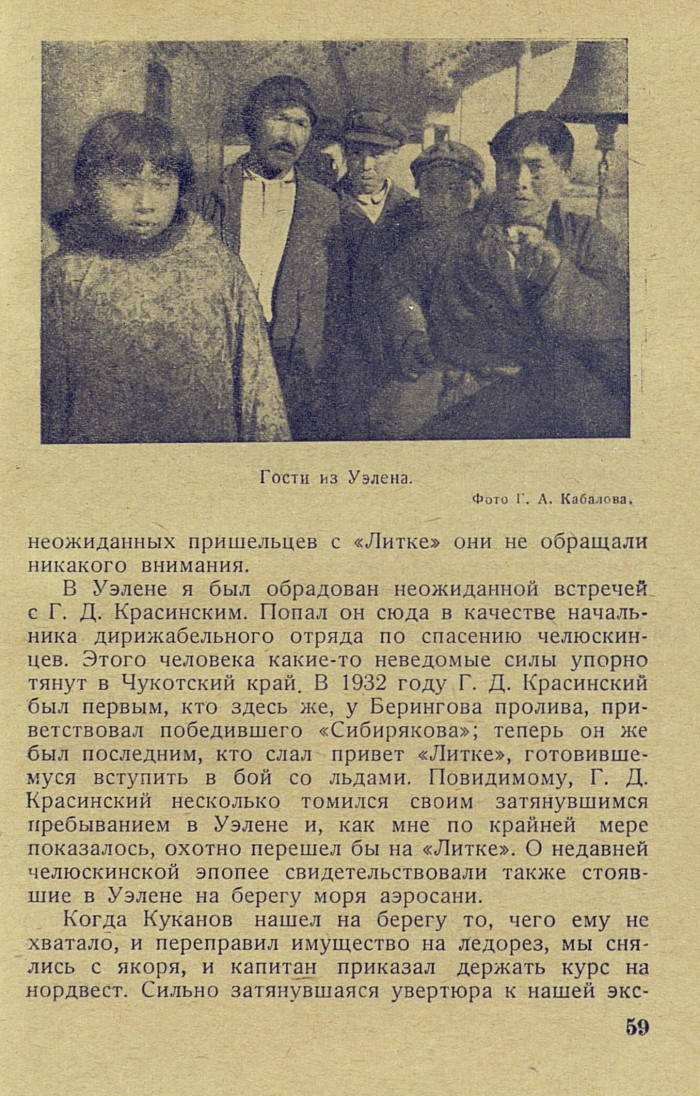 В Уэлене я был обрадован неожиданной встречей с Г. Д. Красинским. Попал он сюда в качестве начальника дирижабельного отряда по спасению челюскинцев. Этого человека какие-то неведомые силы упорно тянут в Чукотский край. В 1932 году Г. Д. Красинский был первым, кто здесь же, у Берингова пролива, приветствовал победившего «Сибирякова»; теперь он же был последним, кто слал привет «Литке», готовившемуся вступить в бой со льдами. Повидимому, Г. Д. Красинский несколько томился своим затянувшимся пребыванием в Уэлене и, как мне по крайней мере показалось, охотно перешел бы на «Литке». О недавней челюскинской эпопее свидетельствовали также стоявшие в Уэлене на берегу моря аэросани.