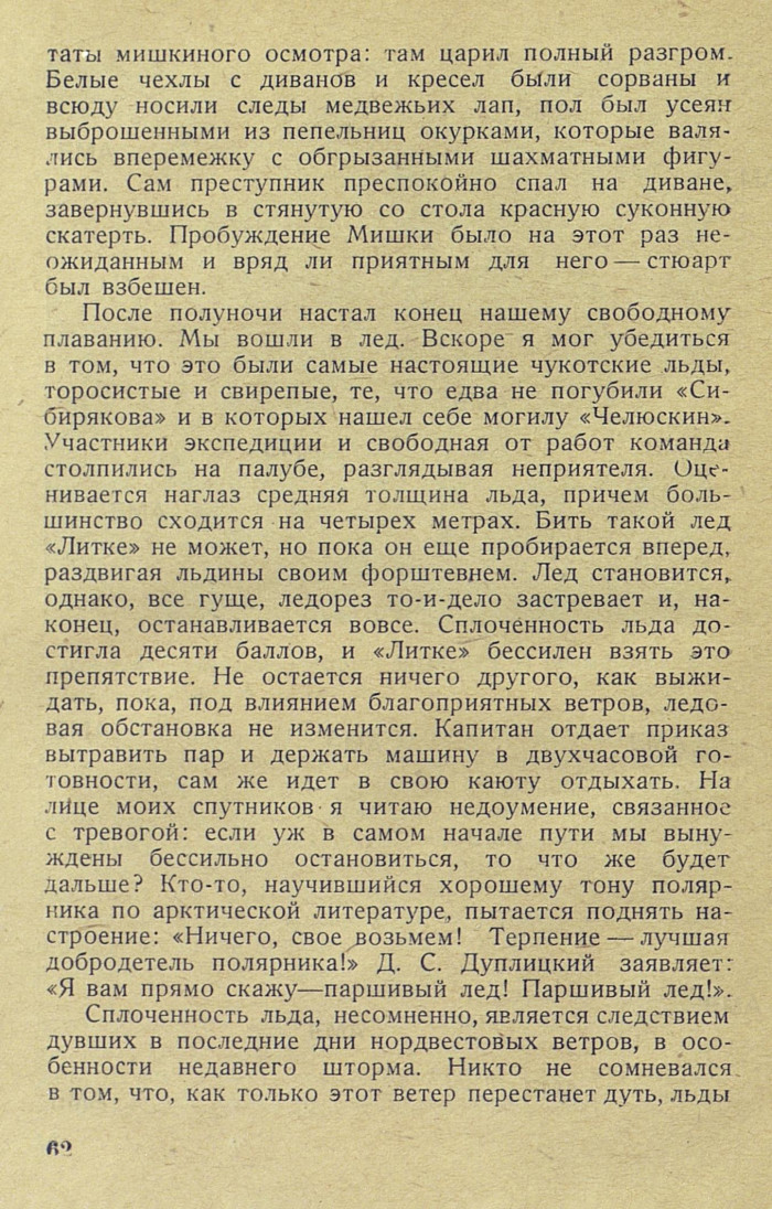 После полуночи настал конец нашему свободному плаванию. Мы вошли в лед. Вскоре я мог убедиться в том, что это были самые настоящие чукотские льды, торосистые и свирепые, те, что едва не погубили «Сибирякове» и в которых нашел себе могилу «Челюскин». Участники экспедиции и свободная от работ команда столпились на палубе, разглядывая неприятеля. Оценивается на глаз средняя толщина льда, причем большинство сходится на четырех метрах. Бить такой лед «Литке» не может, но пока он еще пробирается вперед, раздвигая льдины своим форштевнем. Лед становится, однако, все гуще, ледорез то-и-дело застревает и, наконец, останавливается вовсе. Сплоченность льда достигла десяти баллов, и «Литке» бессилен взять это препятствие. Не остается ничего другого, как выжидать, пока, под влиянием благоприятных ветров, ледовая обстановка не изменится. Капитан отдает приказ вытравить пар и держать машину в двухчасовой готовности, сам же идет в свою каюту отдыхать. На лице моих спутников я читаю недоумение, связанное с тревогой: если уж в самом начале пути мы вынуждены бессильно остановиться, то что же будет дальше? Кто-то, научившийся хорошему тону полярника по арктической литературе, пытается поднять настроение: «Ничего, свое возьмем! Терпение — лучшая добродетель полярника! » Д. С. Дуплицкий заявляет: «Я вам прямо скажу — паршивый лед! Паршивый лед! ».