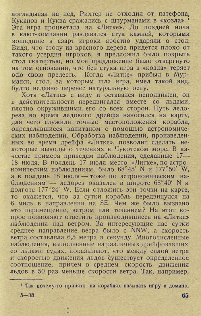 поглядывал на лед, Рихтер не отходил от патефона, Куканов и Куква сражались с штурманами в «козла». {1} Эта игра процветала на «Литке». До поздней ночи в кают-компании раздавался стук камней, которыми вошедшие в азарт игроки яростно ударяли о стол. Видя, что столу из красного дерева придется плохо от такого усердия игроков, я предложил было покрыть стол скатертью, но мое предложение было отвергнуто на том основании, что без стука игра в «козла» теряет всю свою прелесть. Когда «Литке» прибыл в Мурманск, стол, за которым шла игра, имел такой вид, будто недавно перенес натуральную оспу.