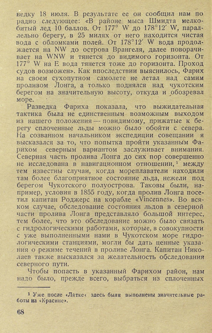 ведку 18 июля. В результате ее он сообщил нам по радио следующее: «В районе мыса Шмидта мелкобитый лед 10 баллов. От 177° W до 178° 12' W, параллельно берегу, в 25 милях от него находится чистая вода с обломками полей. От 178° 12' W вода продолжается на NW до острова Врангеля, далее поворачивает на WNW и тянется до видимого горизонта. От 177° W на Е вода тянется тоже до горизонта. Проход судов возможен». Как впоследствии выяснилось, Фарих на своем сухопутном самолете не летал над самим проливом Лонга, а только поднялся над чукотским берегом на значительную высоту, откуда и обозревал море.