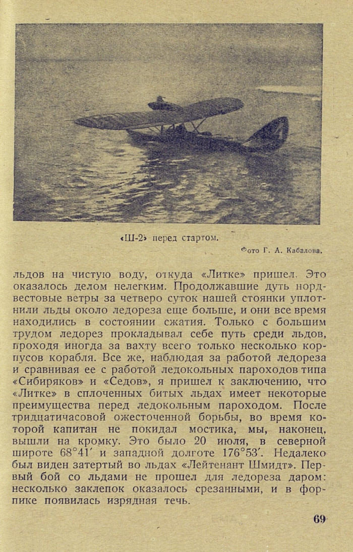 Вдоль кромки льда «Литке» прошел на северо-восток около 60 миль. В широте 69°33' N и долготе 175°36' W мы зашли в шестибалльный лед и остановились, чтобы выпустить на разведку наш самолет в указанном Фарихом направлении. Куканов сделал предварительно небольшой пробный полет, во время которого обнаружил, что мотор работает неисправно. Пришлось снова поднять самолет на судно, где Куква принялся за починку мотора.