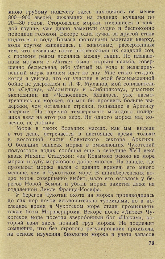 мною грубому подсчету здесь находилось не менее 800—900 зверей, лежавших на льдинах кучками по 20—30 голов. Сторожевые моржи, имевшиеся в каждой группе, уже давно заметили судно и беспокойно поводили головой. Вскоре одна кучка за другой стала кидаться в воду. Брызги фонтанами взлетали кверху, вода кругом запенилась, и животные, рассерженные тем, что незваные гости потревожили их сладкий сон, с громким ревом носились между льдин. По плавающим моржам с «Литке» была открыта пальба, совершенно бесцельная, ибо убитый на воде и незагарпуненный морж камнем идет ко дну. Мне стало стыдно, когда я увидел, что от участия в этой бессмысленной бойне не удержался и Л. Ф. Муханов, мой соплаватель по «Седову», «Малыгину» и «Сибирякову», участник экспедиции на «Челюскине». Казалось, уже насмотревшись на моржей, он мог бы проявить больше выдержки, чем остальные стрелки, попавшие в Арктику впервые. На горячий темперамент молодого полярника взял на этот раз верх. Ни одного моржа мы, конечно, не добыли.