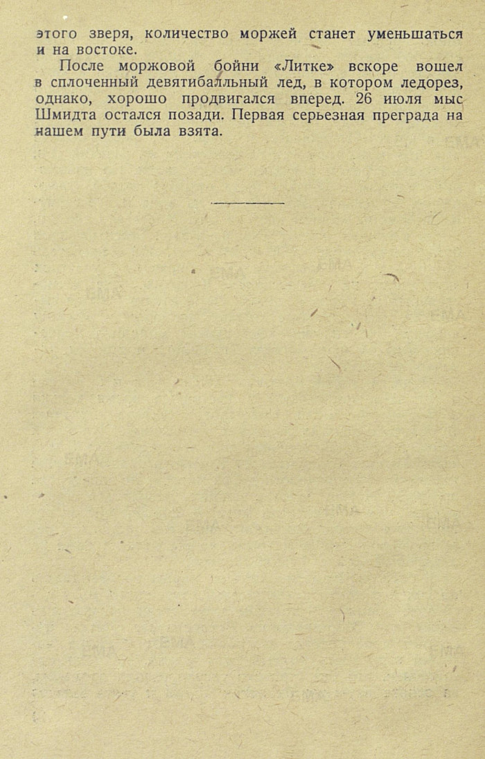 После моржовой бойни «Литке» вскоре вошел в сплоченный девятибалльный лед, в котором ледорез, однако, хорошо продвигался вперед. 26 июля мыс Шмидта остался позади. Первая серьезная преграда на нашем пути была взята.