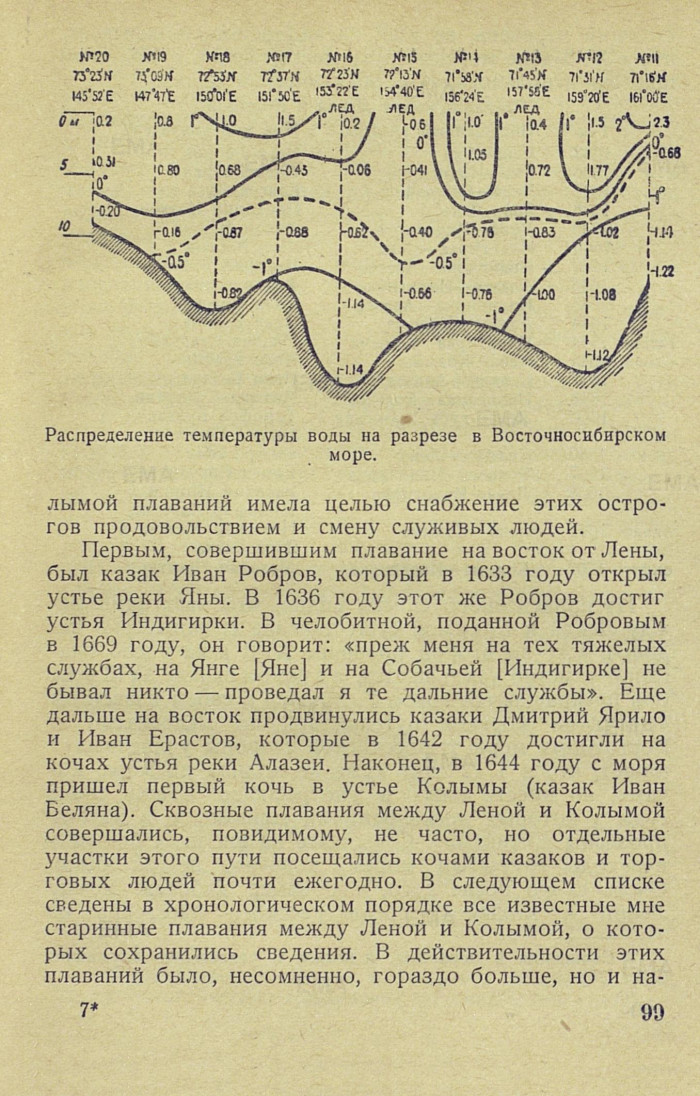 На переходе от Медвежьих островов к Новосибирским мы взяли всего 10 станций, которые и составили разрез. Температурные условия на этом разрезе представлены на стр. 99 в виде изотерм. На этом разрезе отчетливо выделяются относительно высокие температуры поверхностных слоев моря. В крайней восточной части разреза повышение температуры обусловлено влиянием реки Колымы, а на станциях №№ 14 и 17 — влиянием реки Индигирки. Понижение температуры на станции № 15, приходящейся почти против устья реки Индигирки, объясняется наличием льда. Влияние Индигирки сказывается на этой станции