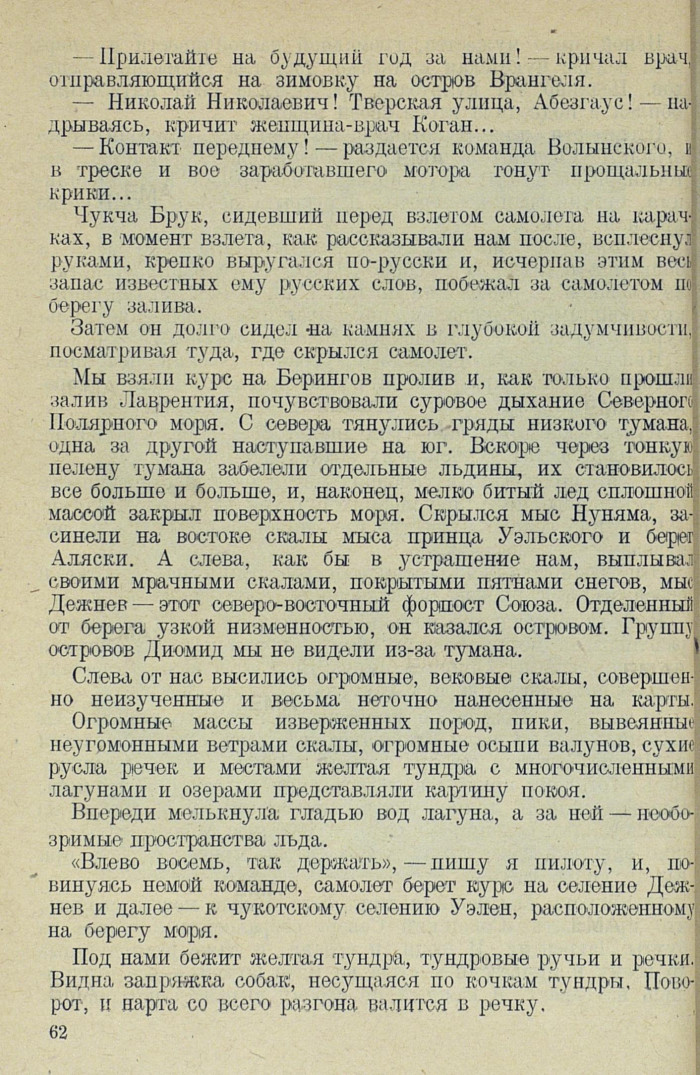 Чукча Брук, сидевший перед взлетом самолета на карачках, в момент взлета, как рассказывали нам после, всплеснул руками, крепко выругался по-русски и, исчерпав этим весь запас известных ему русских слов, побежал за самолетом по берегу залива.
