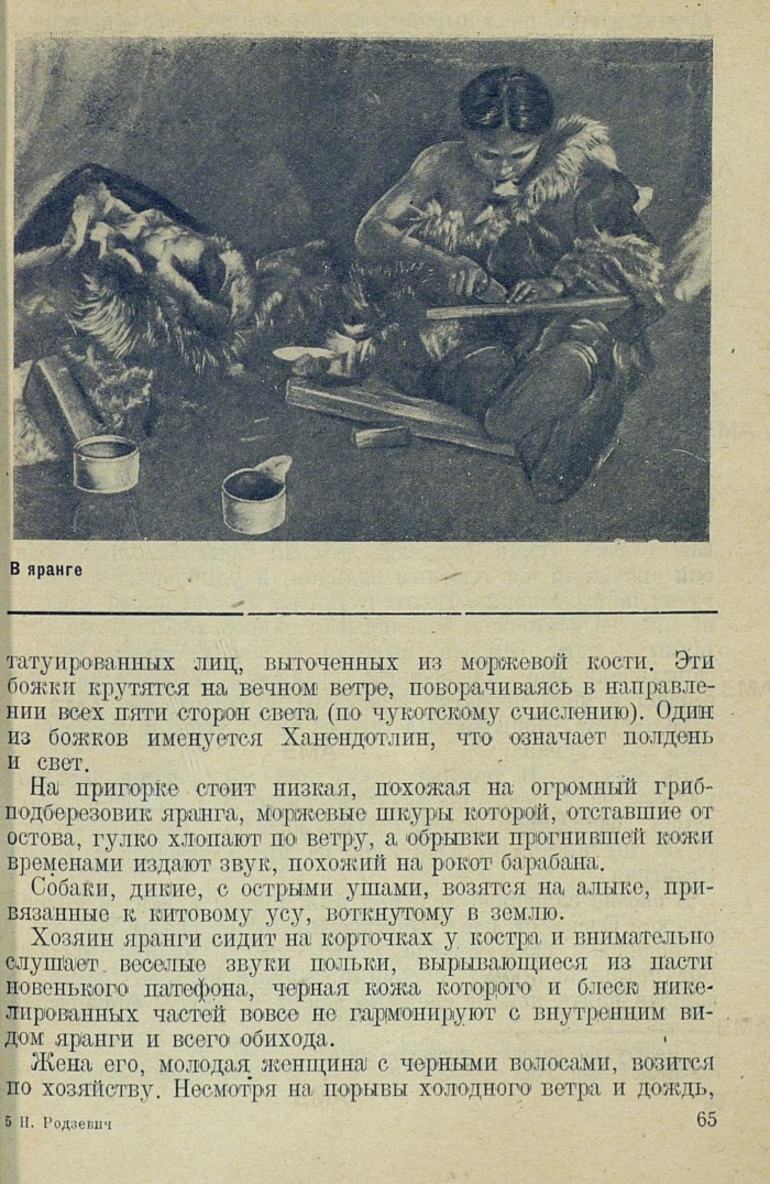 Хозяин яранги сидит на корточках у костра, и внимательно слушает веселые звуки польки, вырывающиеся из пасти новенького патефона, черная кожа которого и блеск никелированных частей вовсе не гармонируют с внутренним видом яранги и всего обихода.