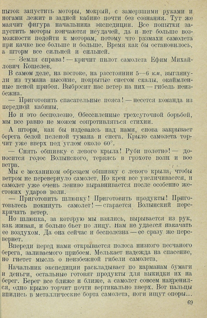 Начальник экспедиции раскладывает по карманам бумаги и деньги, остальные готовят продукты для выкидки их на берег. Берег все ближе и ближе, а самолет совсем накренился, одно крыло торчит почти вертикально вверх. Вот пальцы впились в металлические борта самолета, ноги ищут опоры...