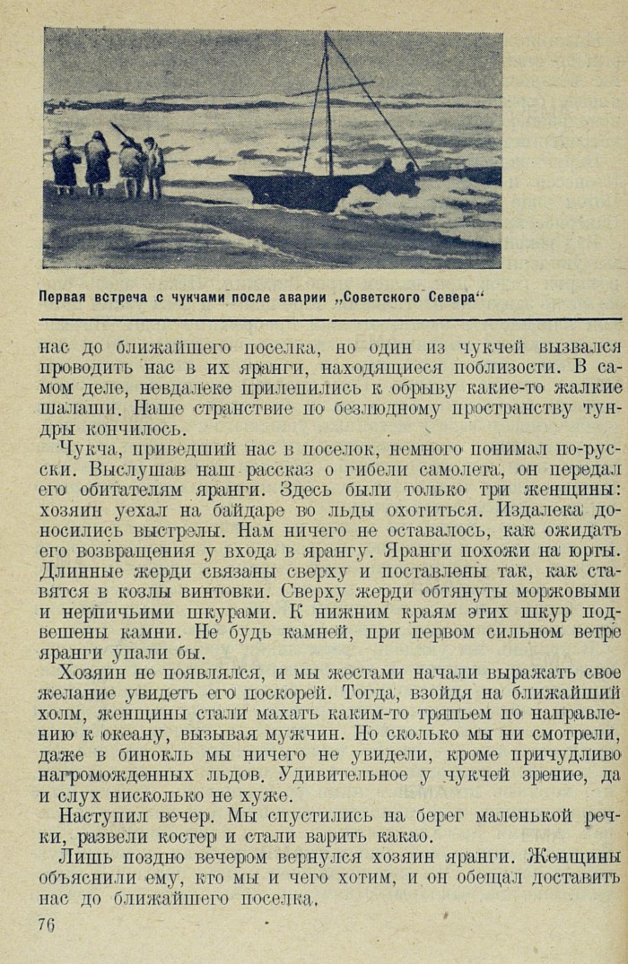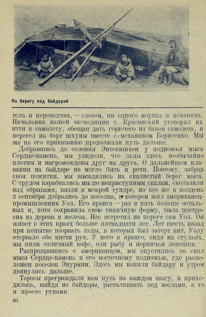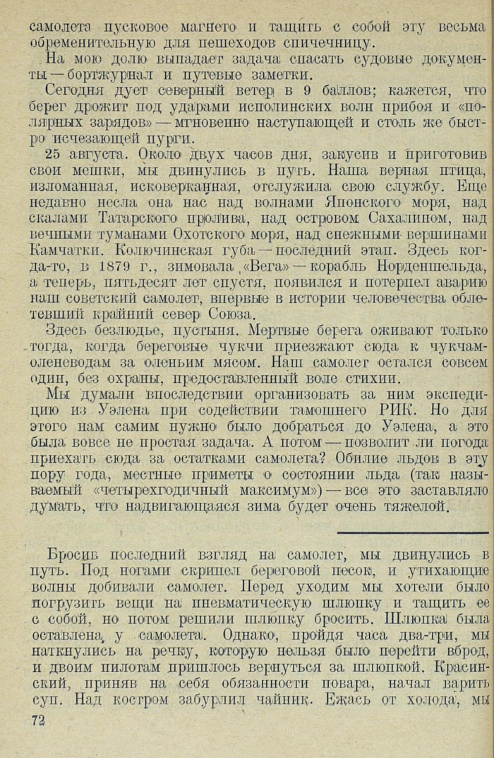 25 августа. Около двух часов дня, закусив и приготовив свои мешки, мы двинулись в путь. Наша верная птица, изломанная, исковерканная, отслужила свою службу. Еще недавно несла она нас над волнами Японского моря, над скалами Татарского пролива, над островом Сахалином, над вечными туманами Охотского моря, над снежными вершинами Камчатки. Колючинская губа, — последний этап. Здесь когда-то, в 1879 г., зимовала ,«Вега» — корабль Норденшельда, а теперь, пятьдесят лот спустя, появился и потерпел аварию наш советский самолет, впервые в истории человечества облетевший крайний север Союза.
