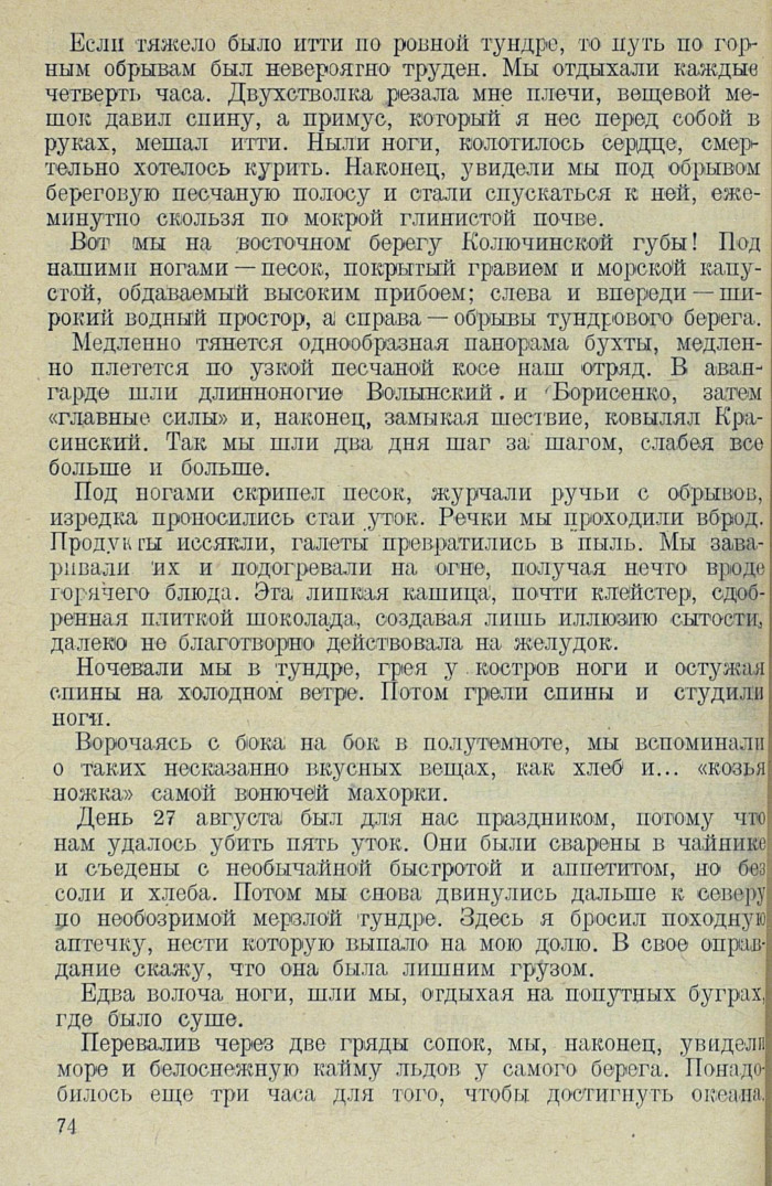 Если тяжело было итти по ровной тундре, то путь по горным обрывам бил невероятно труден. Ми отдыхали каждые четверть часа. Двухстволка резала мне плечи, вещевой мешок давил спину, а примус, который я нес перед собой в руках, мешал итти. Ныли ноги, колотилось сердце, смертельно хотелось курить. Наконец, увидели мы под обрывом береговую песчаную полосу и стали спускаться к ней, ежеминутно скользя по мокрой глинистой почве.