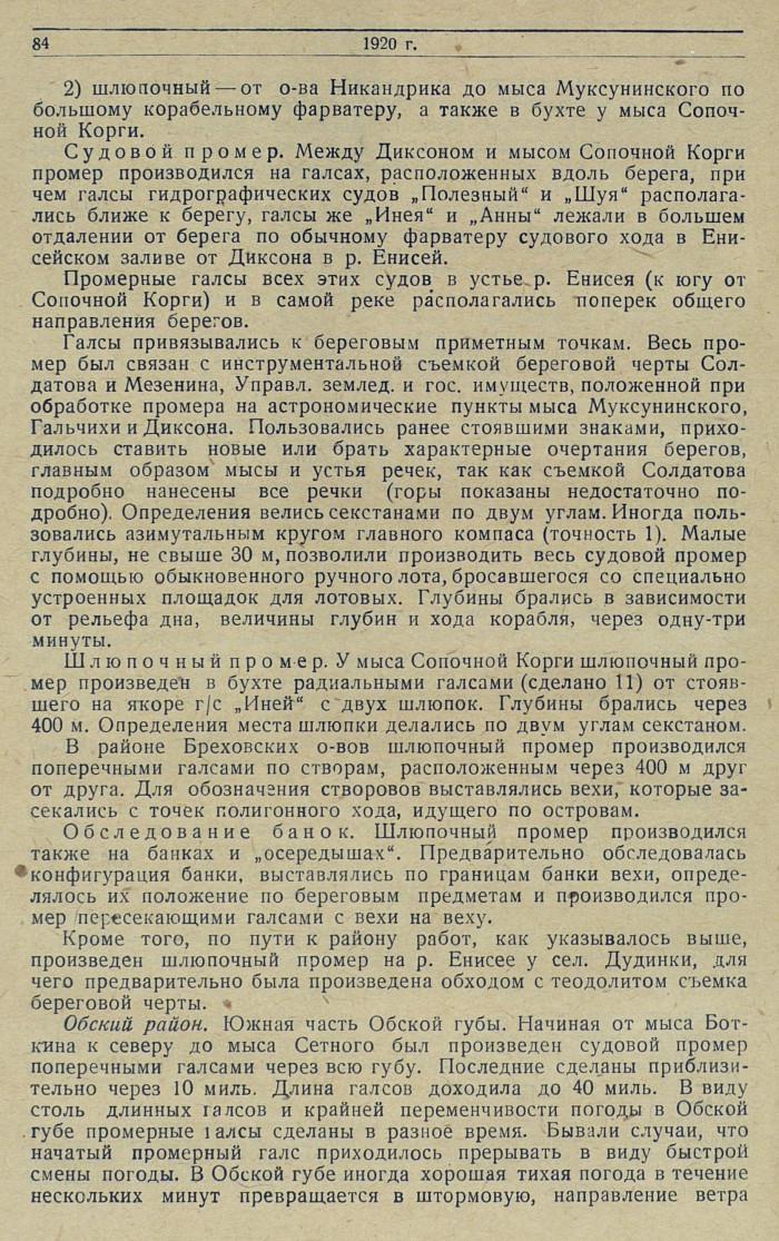Судовой промер. Между Диксоном и мысом Сопочной Корги промер производился на галсах, расположенных вдоль берега, при чем галсы гидрографических судов „Полезный“ и „Шуя“ располагались ближе к берегу, галсы же „Инея“ и „Анны“ лежали в большем отдалении от берега по обычному фарватеру судового хода в Енисейском заливе от Диксона в р. Енисей.