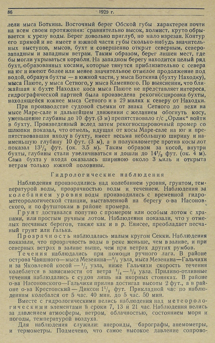 лели мыса Боткина. Восточный берег Обской губы характерен почти на всем своем протяжении: сравнительно высок, холмист, круто обрывается к урезу воды. Берег довольно приглуб, но мало изрезан. Контур его прямой и не имеет в южной части губы сколько-нибудь значительных выступов, мысов, бухт и совершенно открыт северным, северо-западным и западным ветрам. Таким образом, берег лишен мест, где бы могли укрываться корабли. На западном берегу находится целый ряд бухт, образованных косами, которые тянутся приблизительно с севера на юг и имеют более или менее значительное отмелое продолжение под водой, образуя бухты — в южной части, у мыса Боткина (бухту Находку), мыса Паюте, у мыса Сетного, у мыса Каменного. По выяснении, что ближайшая к бухте Находке коса мыса Паюте не представляет интереса, гидрографической партией была произведена рекогносцировка бухты, находящейся южнее мыса Сетного и в 29 милях к северу от Находки.