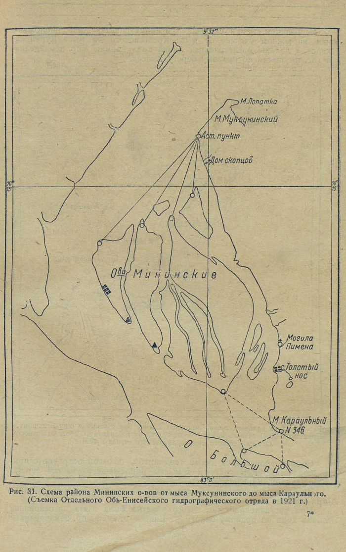 Рис. 31. Схема района Мининских о-вов от мыса Муксунинского до мыса Караульного. (Съемка Отдельного Обь-Енисейского гидрографического отряда в 1921 г.)