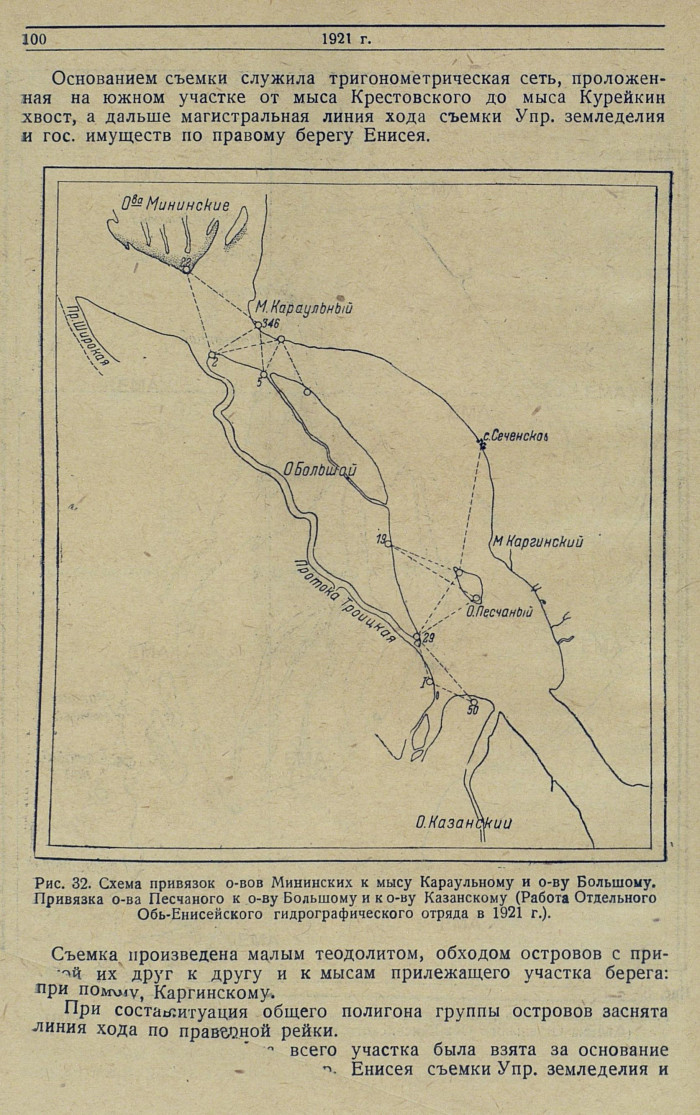 Рис. 32. Схема привязок о-вов Мининских к мысу Караульному и о-ву Большому. Привязка о-ва Песчаного к о-ву Большому и к о-ву Казанскому (Работа Отдельного Обь-Енисейского гидрографического отряда в 1921 г. ).