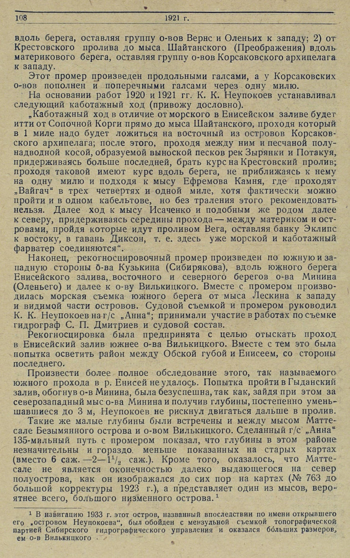 {1} В навигацию 1933 г. этот остров, названный впоследствии по имени открывшего его "островом Неупокоева", был обойден с мензульной съемкой топографической партией Сибирского гидрографического управления и оказался больших размеров, чем о-в Вилькицкого.