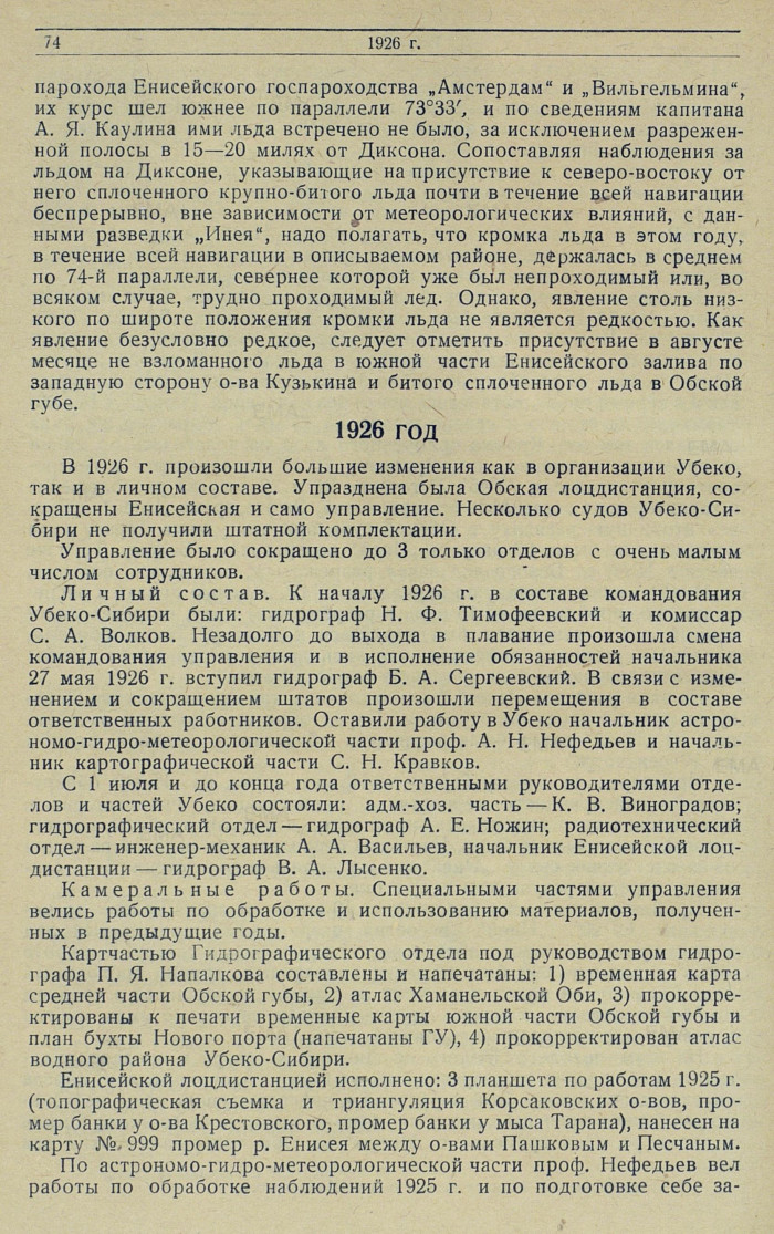 Личный состав. К началу 1926 г. в составе командования Убеко-Сибири были: гидрограф Η.Ф. Тимофеевский и комиссар С.А. Волков. Незадолго до выхода в плавание произошла смена командования управления и в исполнение обязанностей начальника 27 мая 1926 г. вступил гидрограф Б.А. Сергеевский. В связи с изменением и сокращением штатов произошли перемещения в составе ответственных работников. Оставили работу в Убеко начальник астрономо-гидрометеорологической части проф. А.Н. Нефедьев и начальник картографической части С.Н. Кравков.